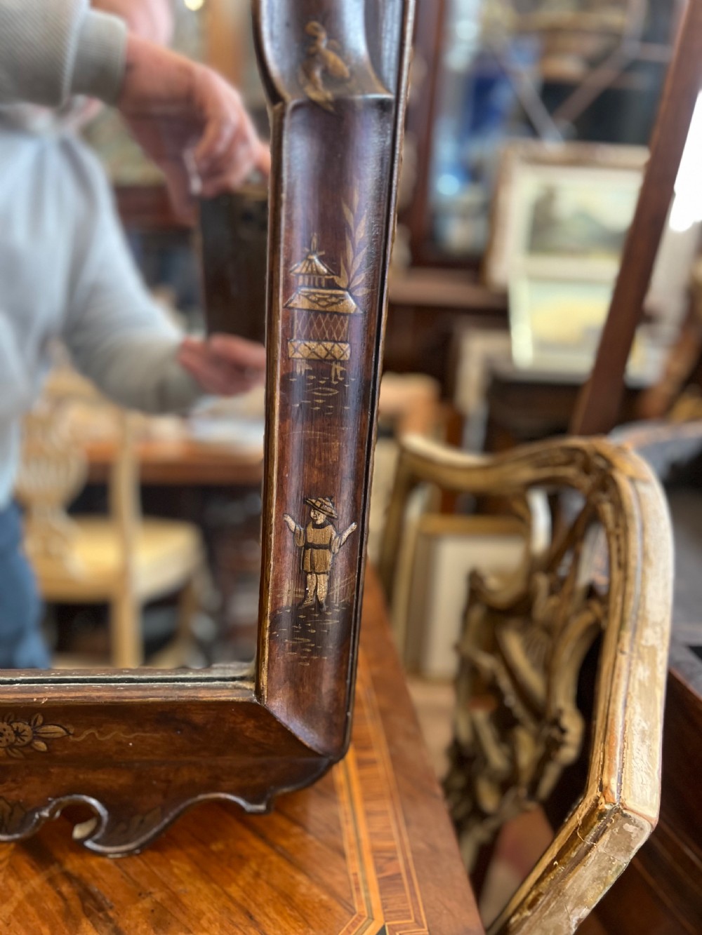 19th century chinoiserie wall mirror, the shaped frame with chinoiserie decoration of figures, buildings and foliage Measuring Height 82cms Width 42cm Condition Good Delivery can easily be arranged for this item smaller items are generally sent free of charge to the uk, larger items can be sent via a courier, I keep this service as cheap as possible, the larger items are picked up and delivered to you within 7-10 days should you require a quicker delivery expect to pay at least double the normal cost. If you are unhappy with any item I offer a full money back guarantee once the item is safely back in my possession and undamaged as a result of misuse. Please feel free to ring me with any queries you may have, I'm always happy to discuss anything to do with antiques !! Opening hours Thursday to Saturday 10am - 6pm. Or by appointment.