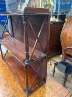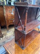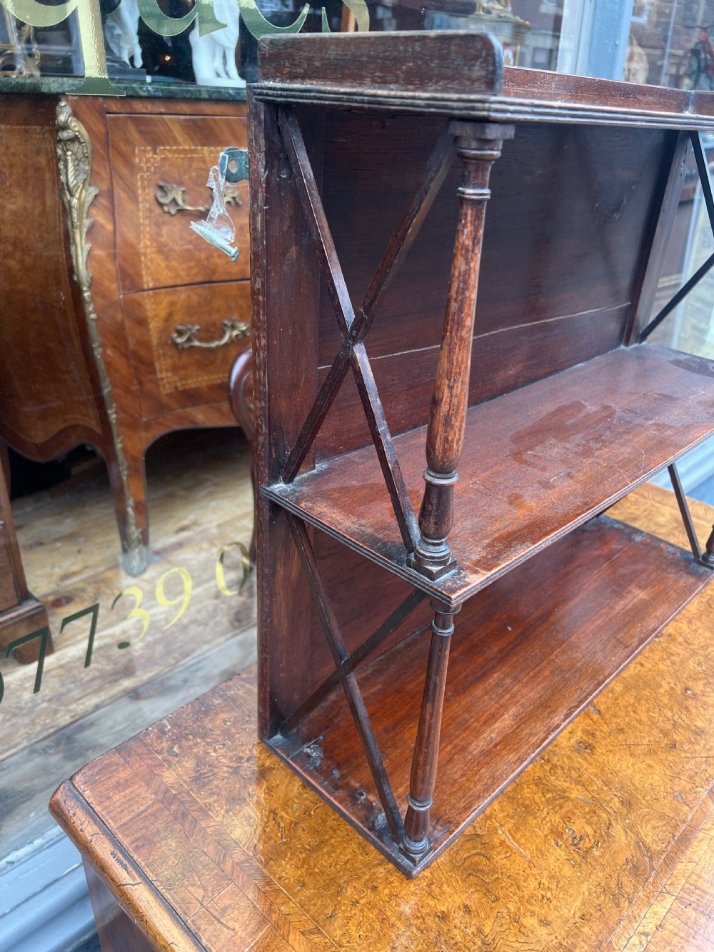A Georgian mahogany set of wall shelves with three shelves and a galleried top, the sides decorated with x framed braces Measuring Height 54cms Width 61cms Depth 19cms Condition Good some old horizontal splits in the backing board through age Delivery can easily be arranged for this item smaller items are generally sent free of charge to the uk, larger items can be sent via a courier, I keep this service as cheap as possible, the larger items are picked up and delivered to you within 7-10 days should you require a quicker delivery expect to pay at least double the normal cost. If you are unhappy with any item I offer a full money back guarantee once the item is safely back in my possession and undamaged as a result of misuse. Please feel free to ring me with any queries you may have, I'm always happy to discuss anything to do with antiques !! Opening hours Thursday to Saturday 10am - 6pm. Or by appointment.