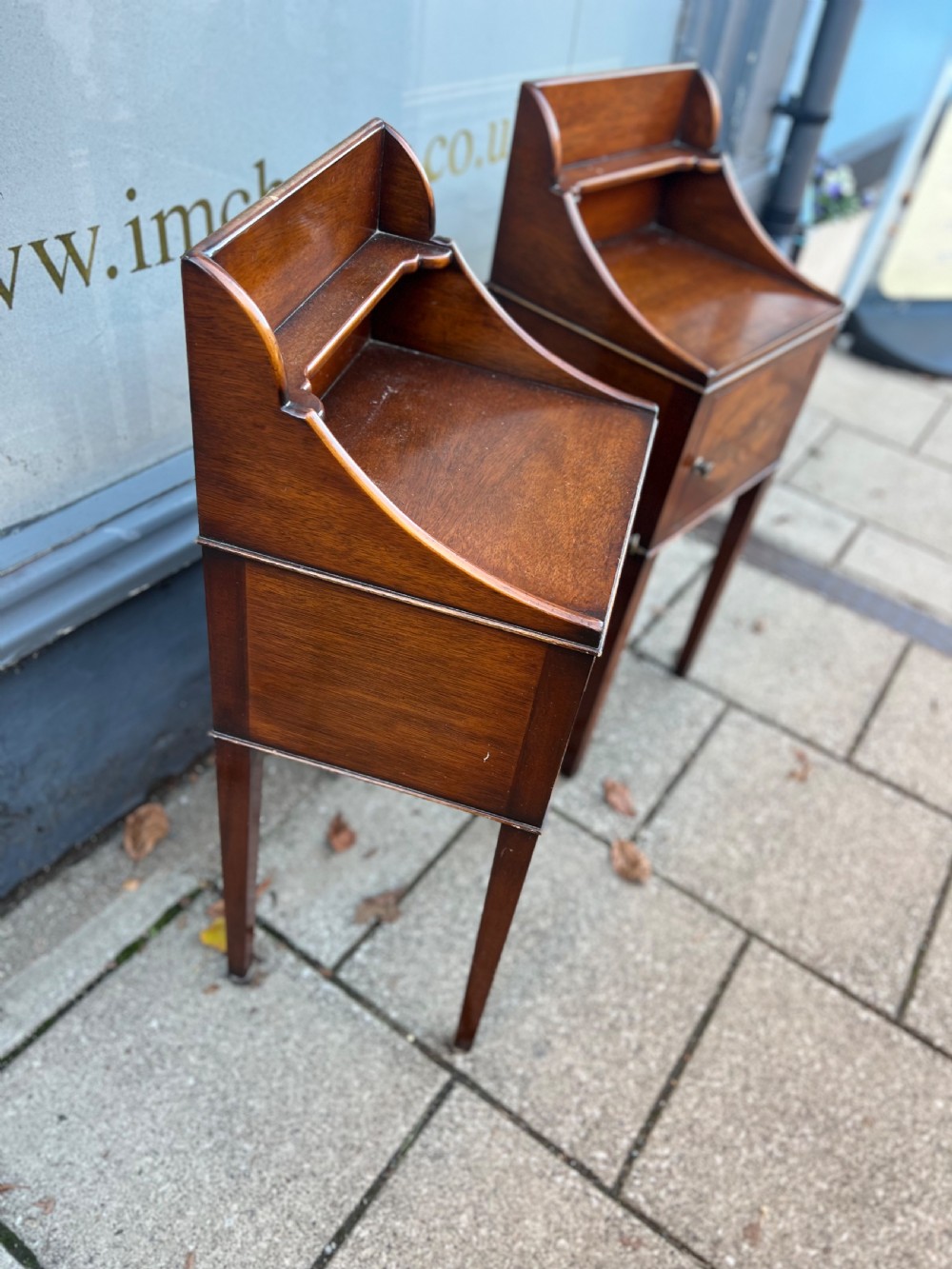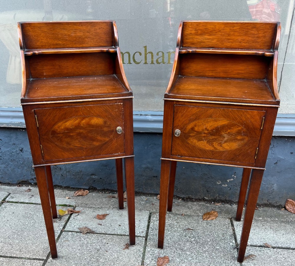 A pair of Edwardian bedside cabinets in the Georgian taste, with opening doors, they are mahogany and then a flame mahogany door with an oval inlayed panel on four tapering legs and with a upstand, each with a brass pull handle Measuring Height 102 cm Width 39 cm Depth 36 cm Condition Good, will be waxed polished prior to delivery Delivery can easily be arranged for this item smaller items are generally sent free of charge to the uk, larger items can be sent via a courier, I keep this service as cheap as possible, the larger items are picked up and delivered to you within 7-10 days should you require a quicker delivery expect to pay at least double the normal cost. If you are unhappy with any item I offer a full money back guarantee once the item is safely back in my possession and undamaged as a result of misuse. Please feel free to ring me with any queries you may have, I'm always happy to discuss anything to do with antiques !! Opening hours Thursday to Saturday 10am - 6pm. Or by appointment.