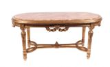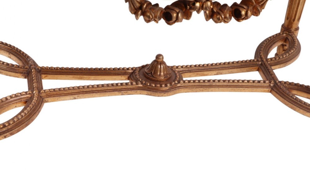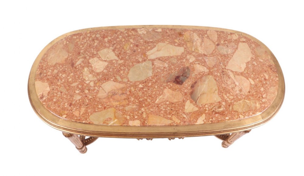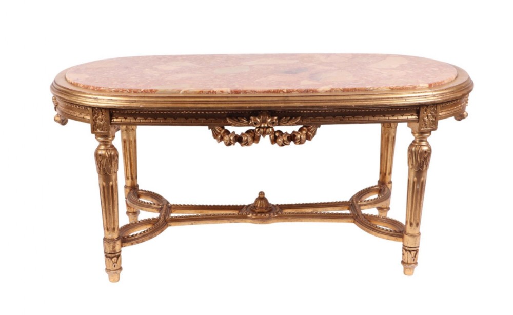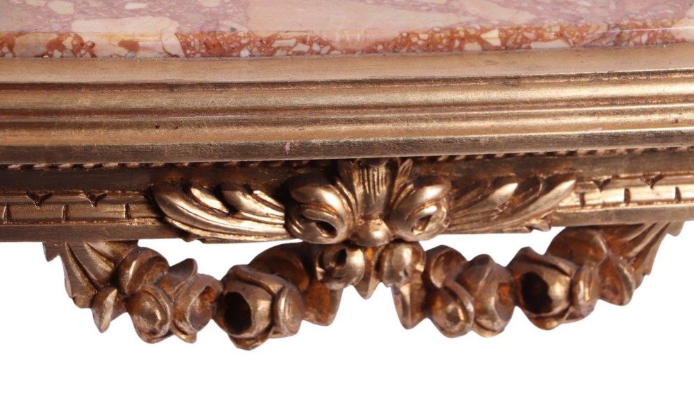 An ornately carved giltwood coffee or centre table with swag decoration and inset pink marble top, measuring Width 115 cms Height 56cms. Condition Re gilded but no damage Delivery can easily be arranged for this item smaller items are generally sent free of charge to the uk, larger items can be sent via a courier, I keep this service as cheap as possible, the larger items are picked up and delivered to you within 7-10 days should you require a quicker delivery expect to pay at least double the normal cost. If you are unhappy with any item I offer a full money back guarantee once the item is safely back in my possession and undamaged as a result of misuse. Please feel free to ring me with any queries you may have, I'm always happy to discuss anything to do with antiques !! Opening hours Thursday to Saturday 10am - 6pm. Or by appointment.