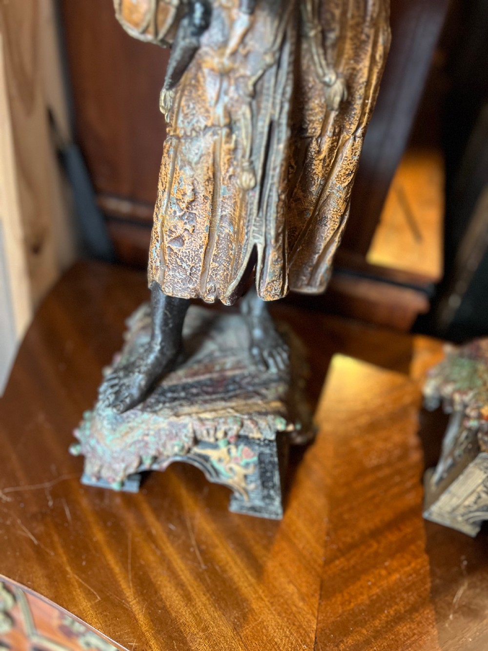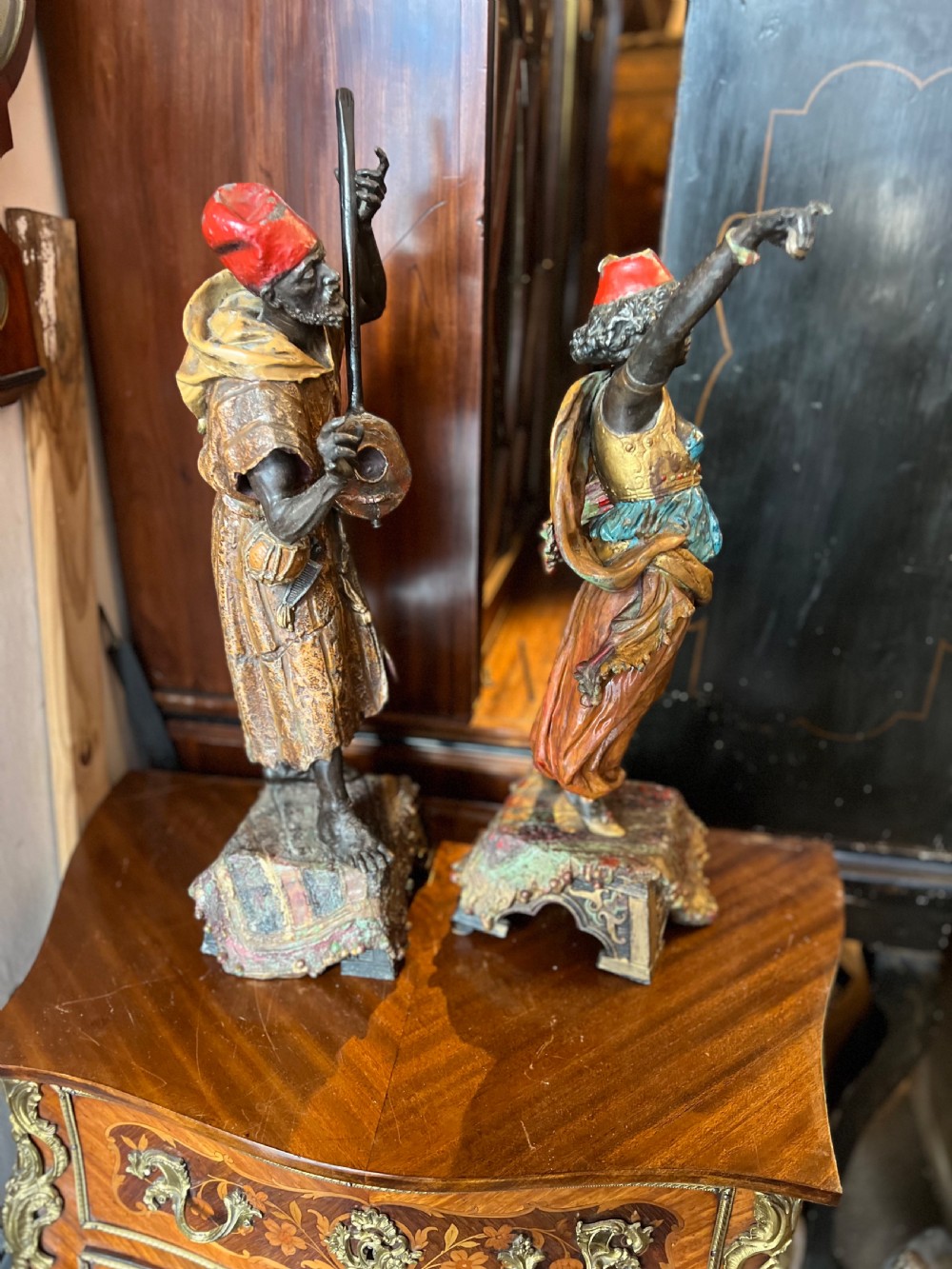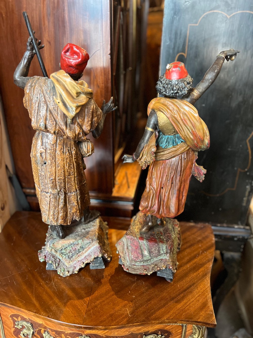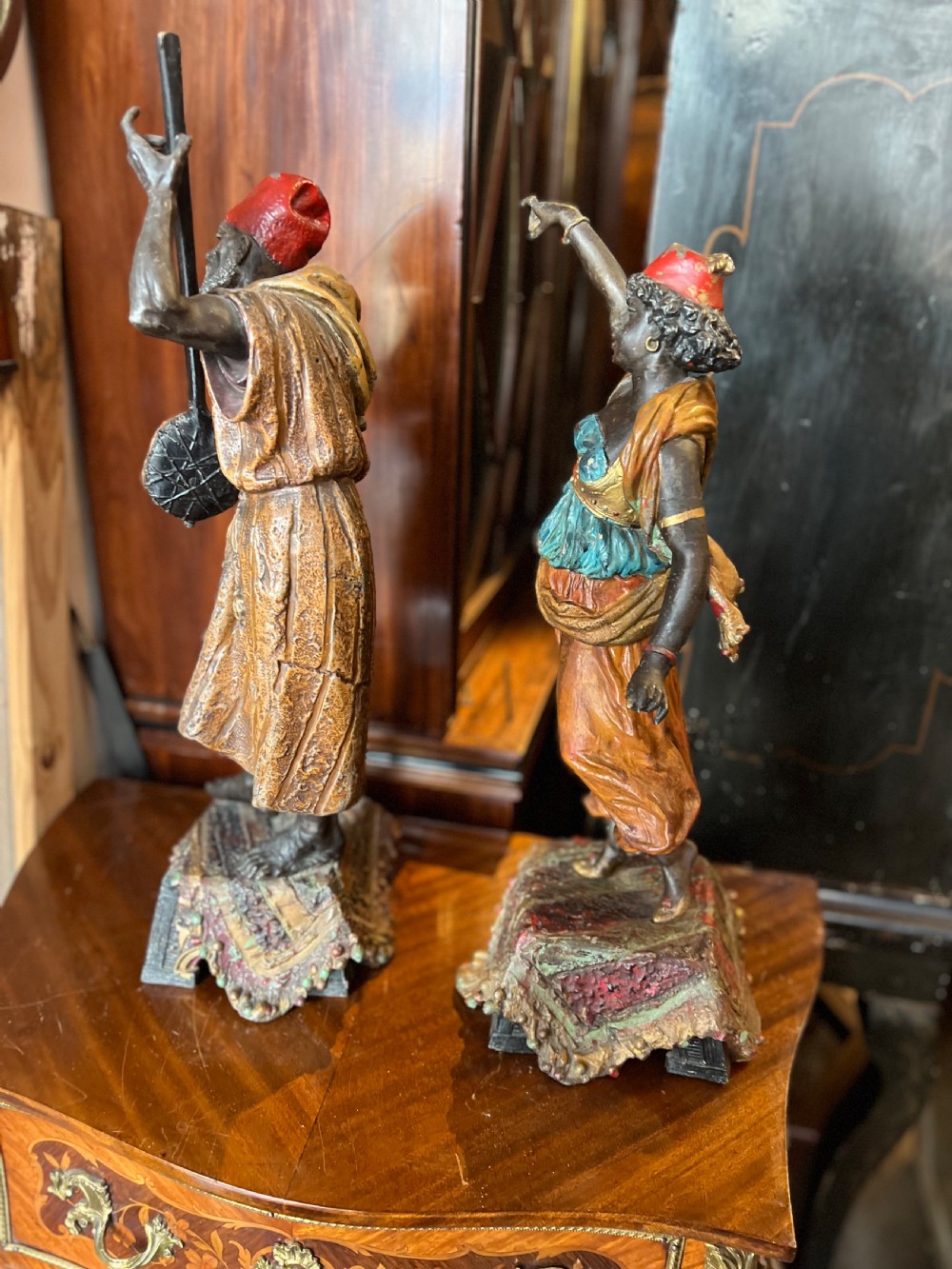 Pair of large painted spelter figures depicting a moorish musician and dancer, in very detailed form