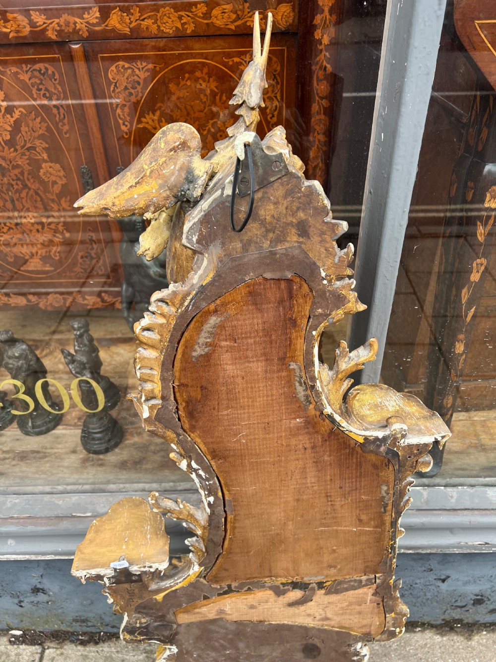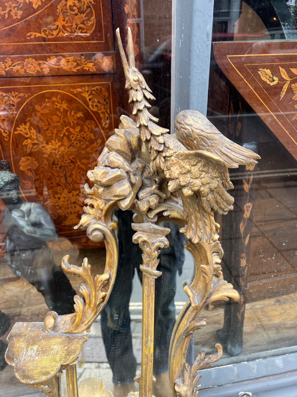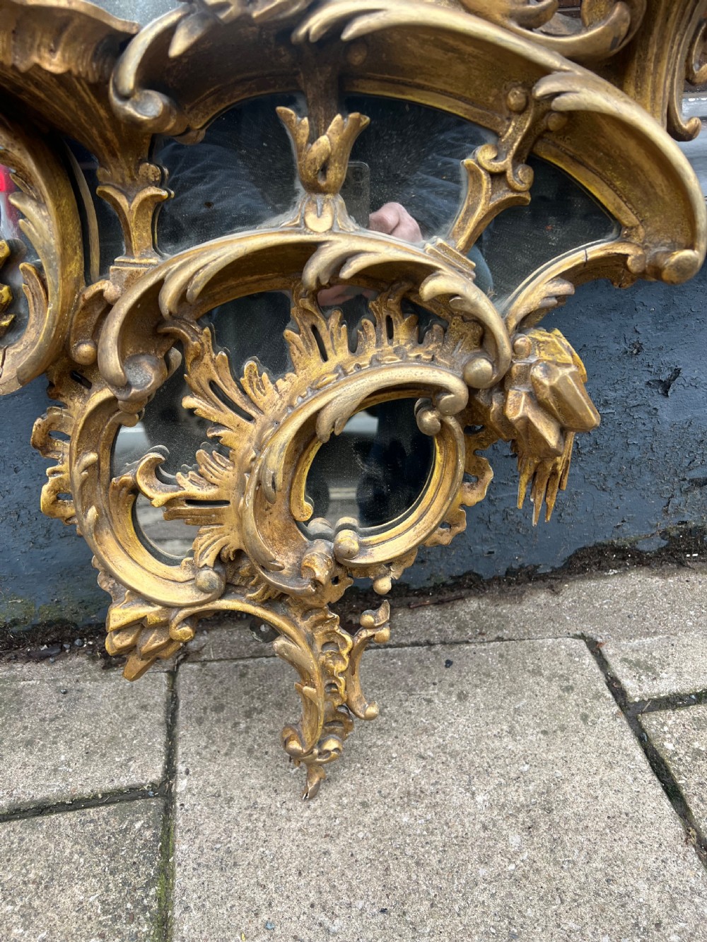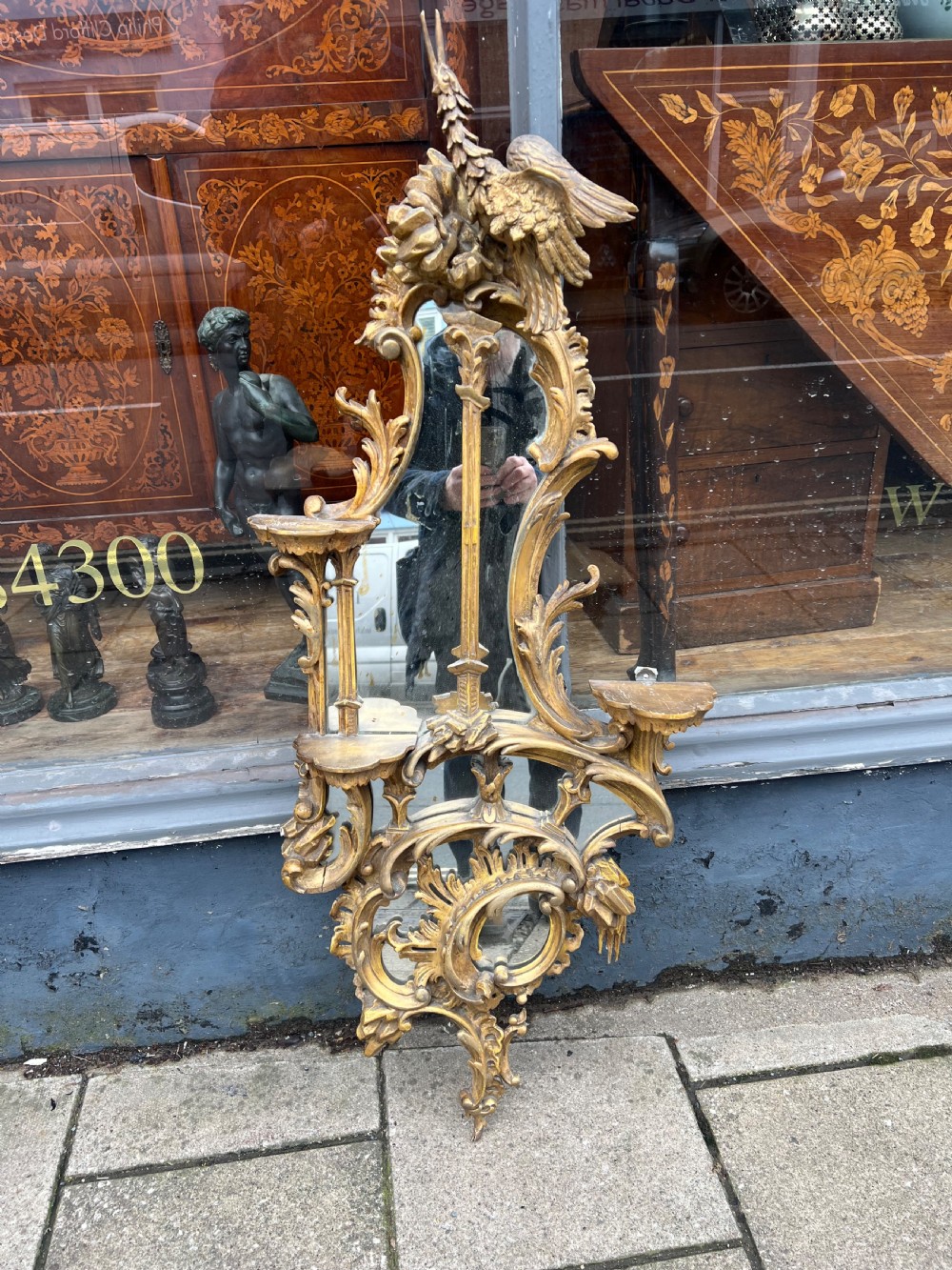 The mirror has three shaped shelves for displaying vases or ornaments