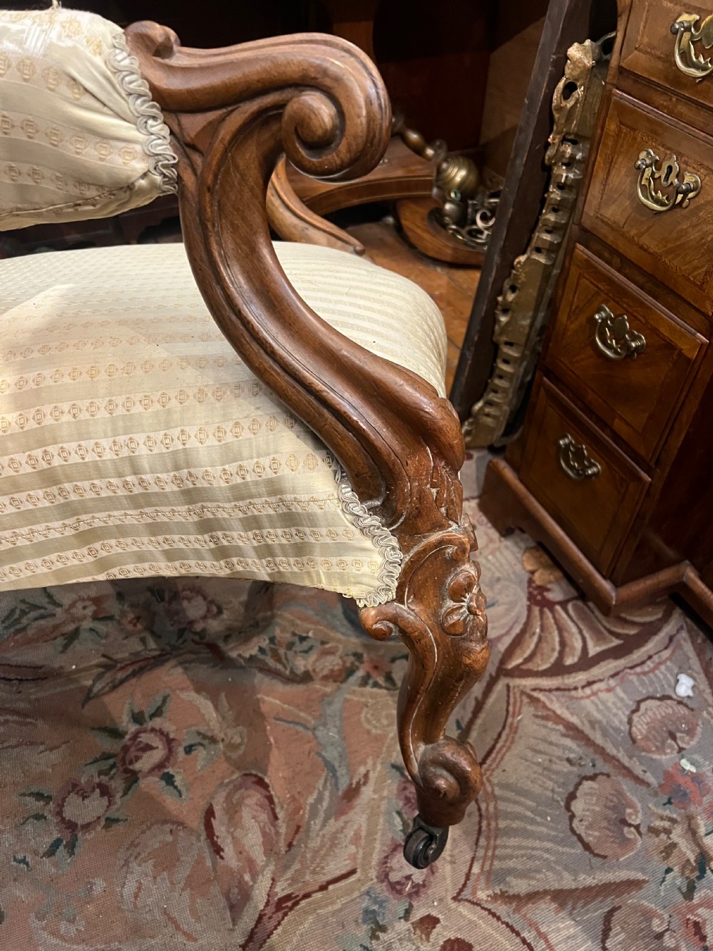 Rosewood framed carved show wood armchair with a cream coloured upholstery. Measuring Height 88 cms Width 69 cms Depth 73 cms Height to seat 43 cms Condition Solid frame upholstery is worn and stained Delivery can easily be arranged for this item smaller items are generally sent free of charge to the uk, larger items can be sent via a courier, I keep this service as cheap as possible, the larger items are picked up and delivered to you within 7-10 days should you require a quicker delivery expect to pay at least double the normal cost. If you are unhappy with any item I offer a full money back guarantee once the item is safely back in my possession and undamaged as a result of misuse. Please feel free to ring me with any queries you may have, I'm always happy to discuss anything to do with antiques !! Opening hours Thursday to Saturday 10am - 6pm. Or by appointment.