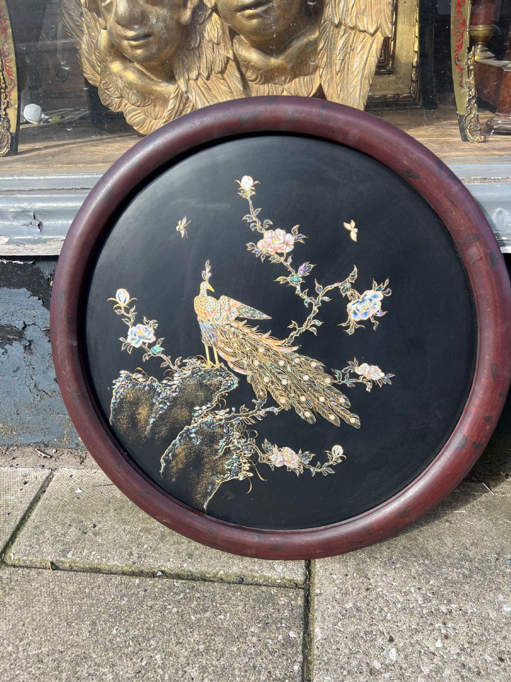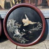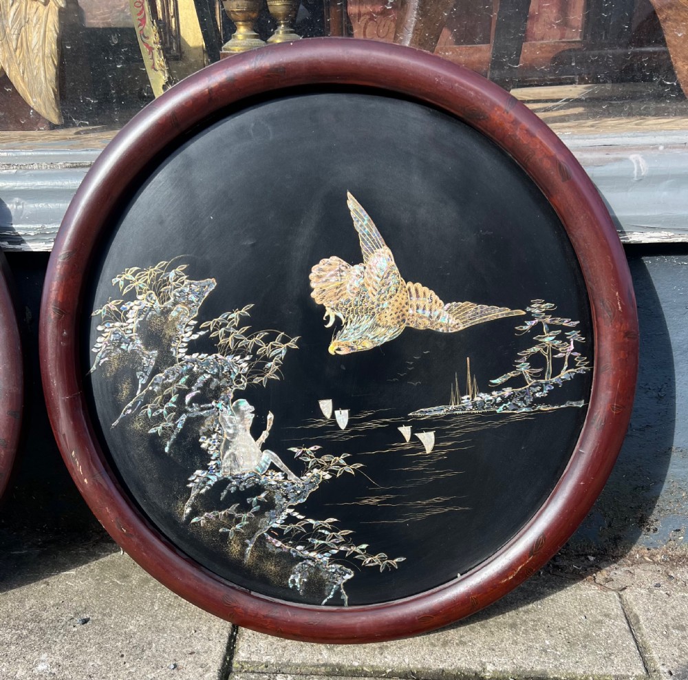 A pair of Japanese lacquered roundels, one featuring an eagle and a monkey the other a peacock beautifully picked out in mother of pearl and abalone shells