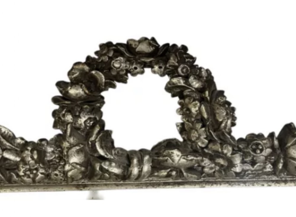 Classical inspired silvered overmantel wall mirror. Rectangular form with gadrooned border and crested garland pediment. Bevelled edge mirror inset to centre with original back panels in place.