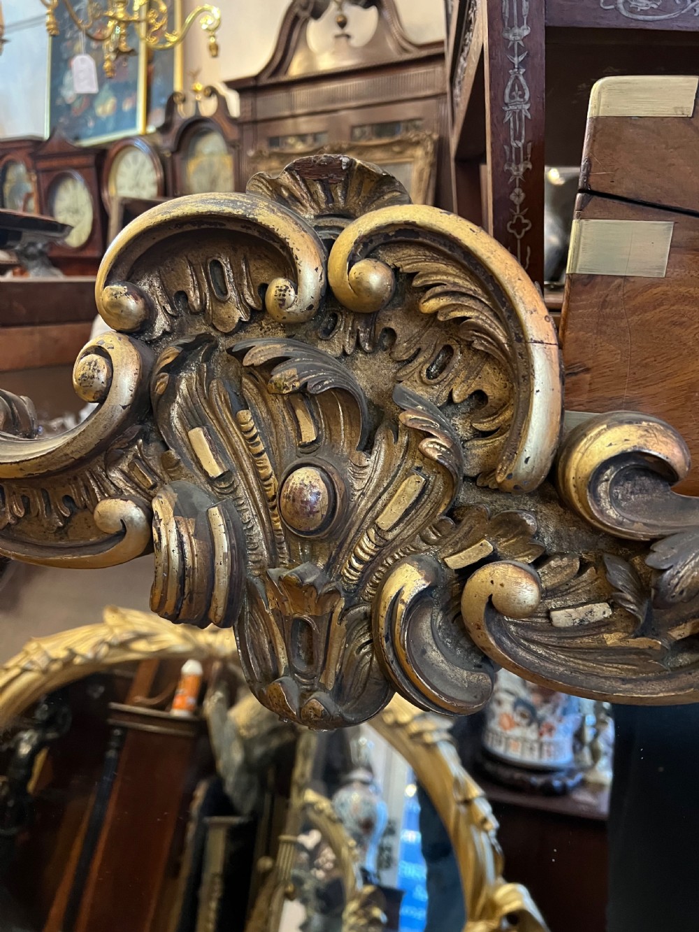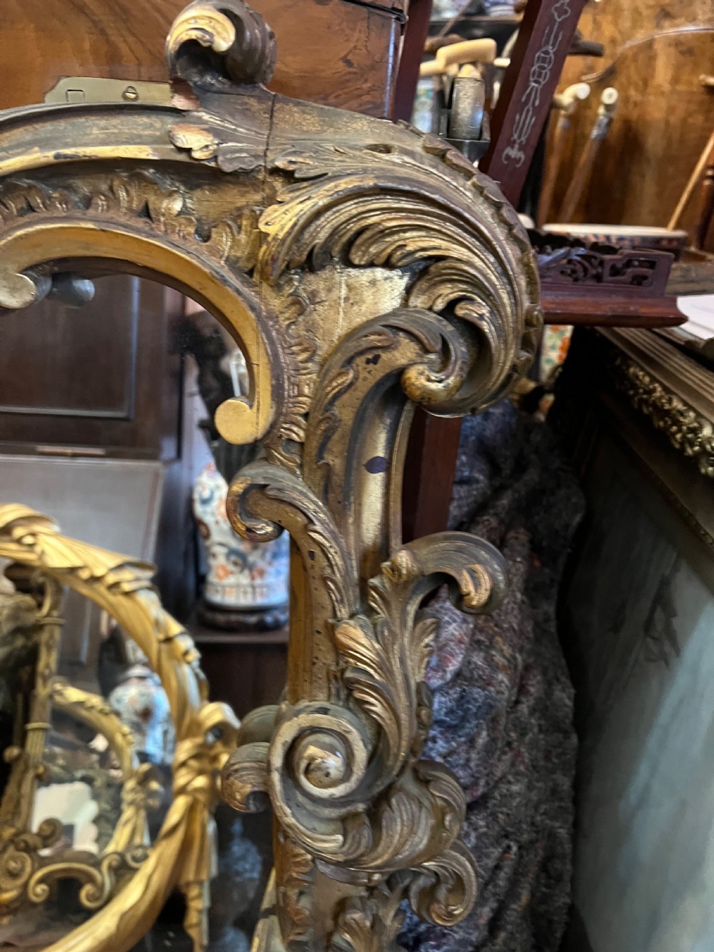 Large rococo influenced pier mirror, carved wood and then gilded and highlighted, good deep carving. Measuring Height 155 cms Width 88 cms Condition Good, wear associated with age but original gilt Delivery can easily be arranged for this item smaller items are generally sent free of charge to the uk, larger items can be sent via a courier, I keep this service as cheap as possible, the larger items are picked up and delivered to you within 7-10 days should you require a quicker delivery expect to pay at least double the normal cost. If you are unhappy with any item I offer a full money back guarantee once the item is safely back in my possession and undamaged as a result of misuse. Please feel free to ring me with any queries you may have, I'm always happy to discuss anything to do with antiques !! Opening hours Thursday to Saturday 10am - 6pm. Or by appointment.