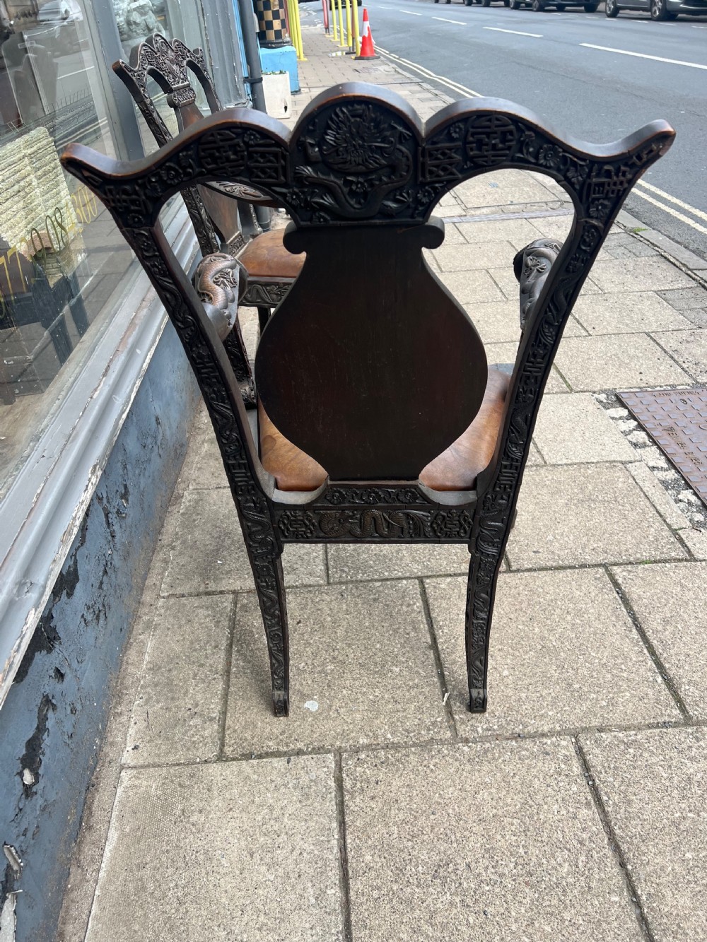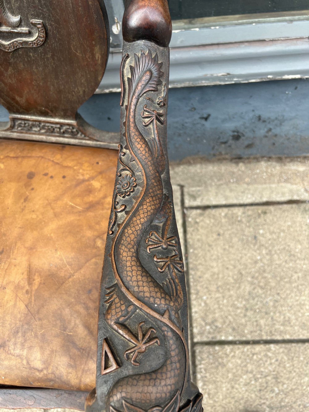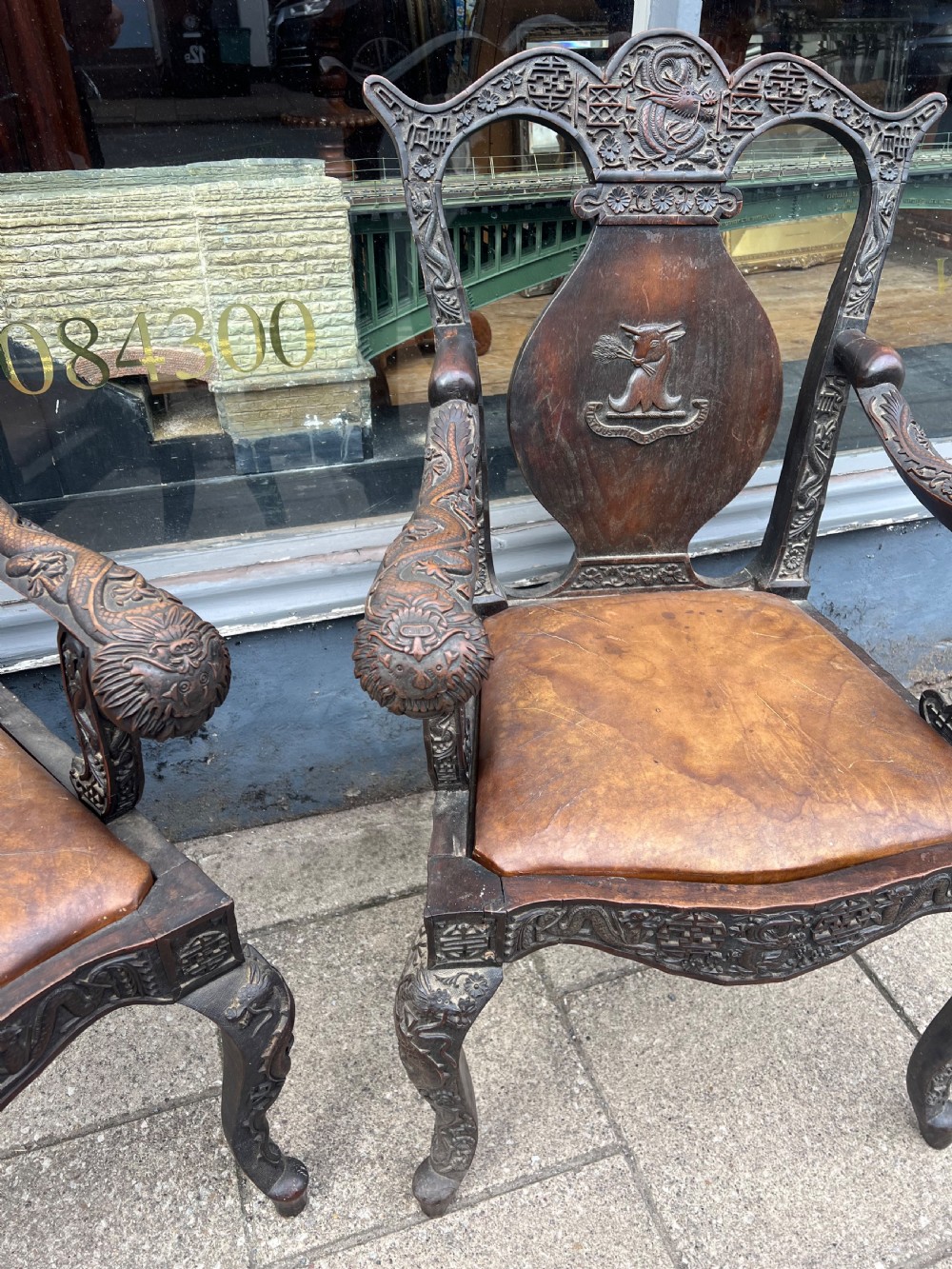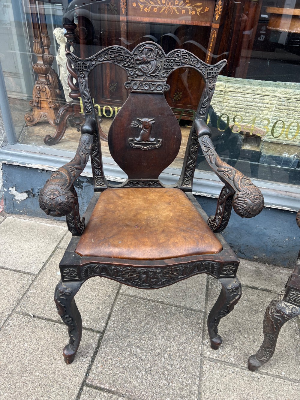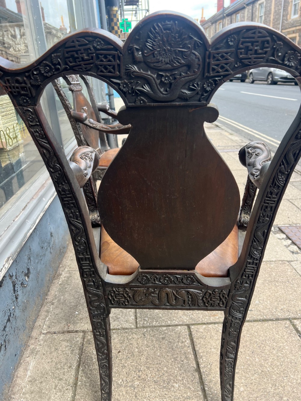 A pair of C19th Chinese armchairs, profusely carved all over, the back splat with a family's crest, the drop in seats covered in brown leather Measuring Height 100 cms Width 66 cms Depth 60 cms Condition Good all over, loose joint on one front leg but I will reglue and give the chairs a wax Delivery can easily be arranged for this item smaller items are generally sent free of charge to the uk, larger items can be sent via a courier, I keep this service as cheap as possible, the larger items are picked up and delivered to you within 7-10 days should you require a quicker delivery expect to pay at least double the normal cost. If you are unhappy with any item I offer a full money back guarantee once the item is safely back in my possession and undamaged as a result of misuse. Please feel free to ring me with any queries you may have, I'm always happy to discuss anything to do with antiques !! Opening hours Thursday to Saturday 10am - 6pm. Or by appointment.