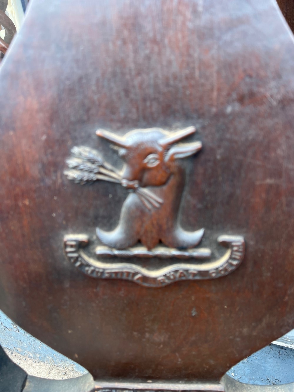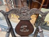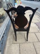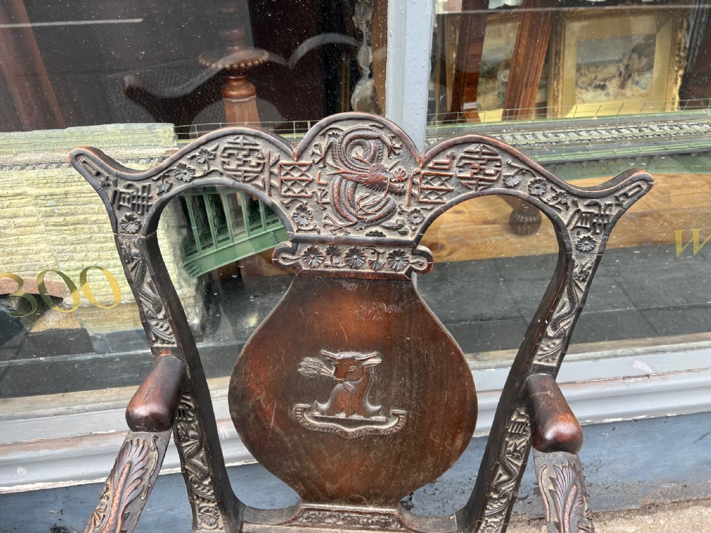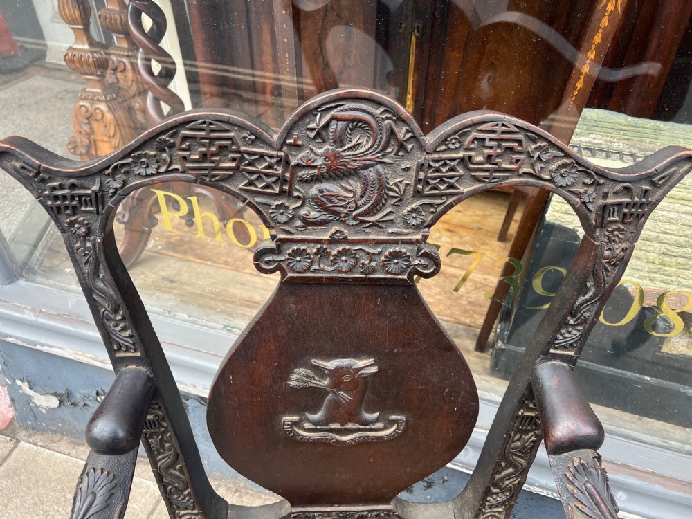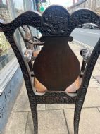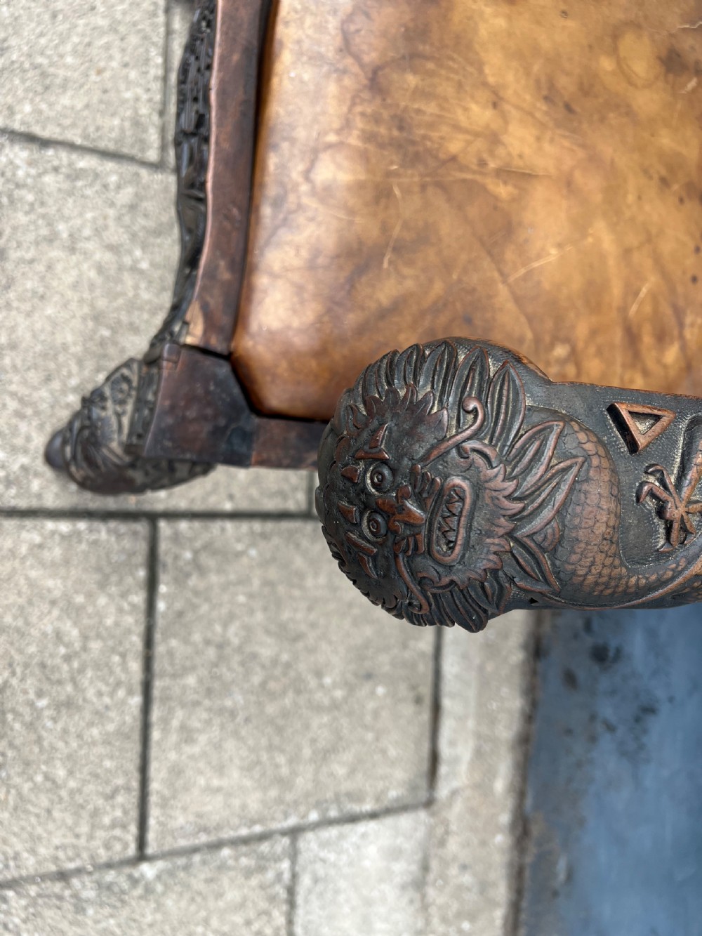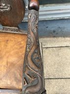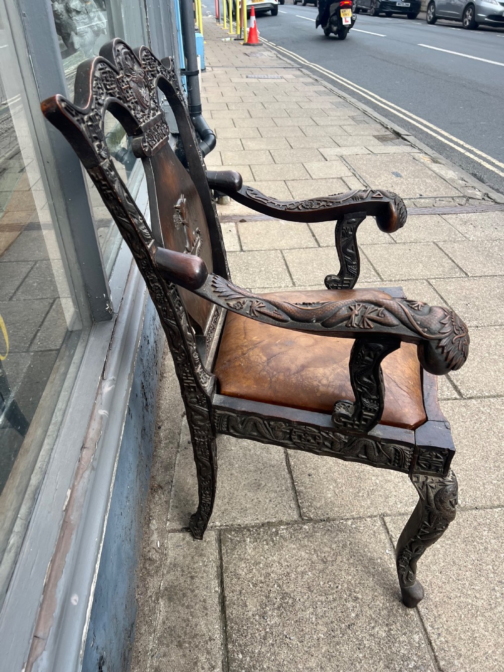 A pair of C19th Chinese armchairs, profusely carved all over, the back splat with a family's crest, the drop in seats covered in brown leather Measuring Height 100 cms Width 66 cms Depth 60 cms Condition Good all over, loose joint on one front leg but I will reglue and give the chairs a wax Delivery can easily be arranged for this item smaller items are generally sent free of charge to the uk, larger items can be sent via a courier, I keep this service as cheap as possible, the larger items are picked up and delivered to you within 7-10 days should you require a quicker delivery expect to pay at least double the normal cost. If you are unhappy with any item I offer a full money back guarantee once the item is safely back in my possession and undamaged as a result of misuse. Please feel free to ring me with any queries you may have, I'm always happy to discuss anything to do with antiques !! Opening hours Thursday to Saturday 10am - 6pm. Or by appointment.