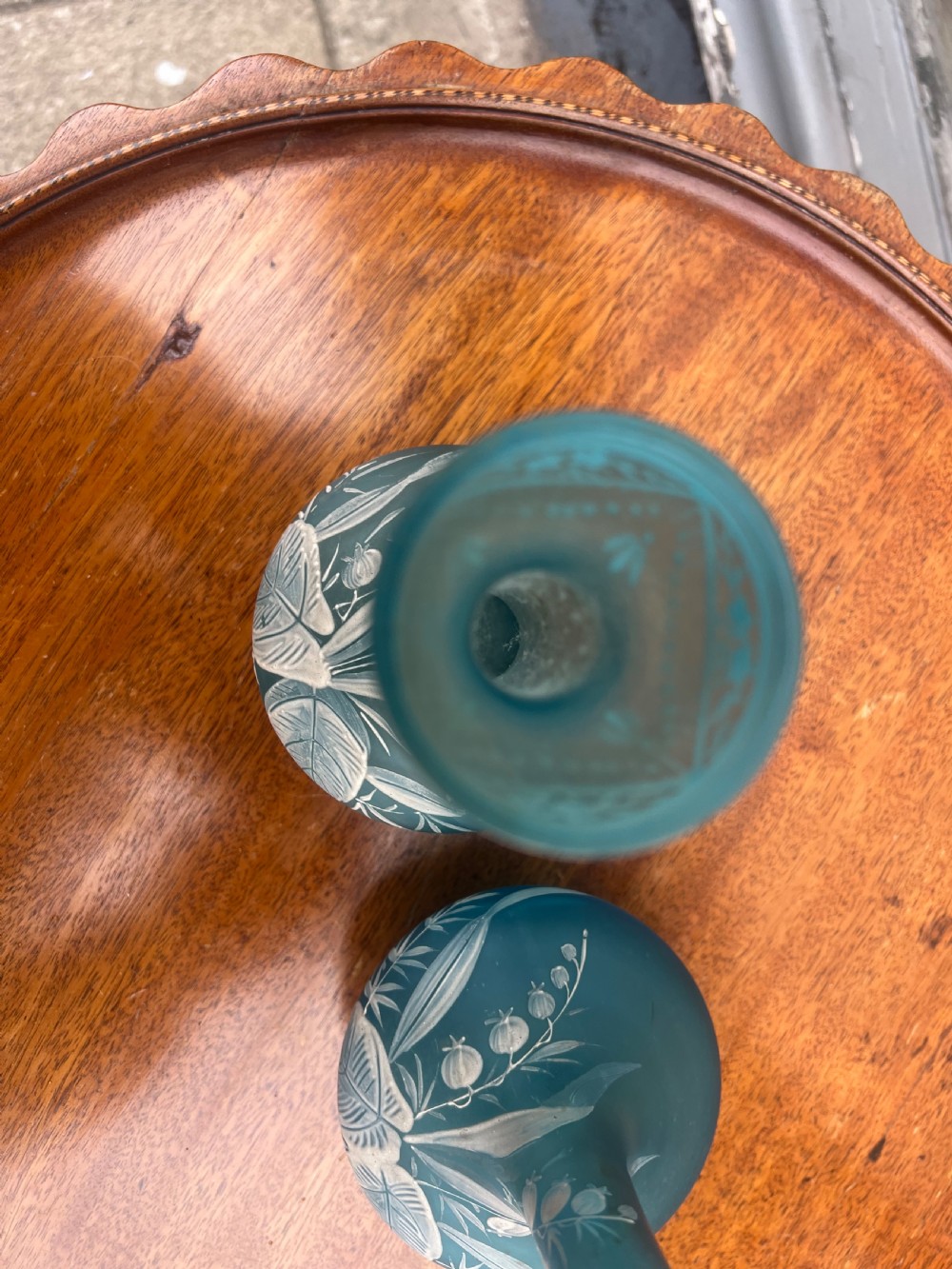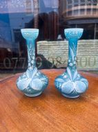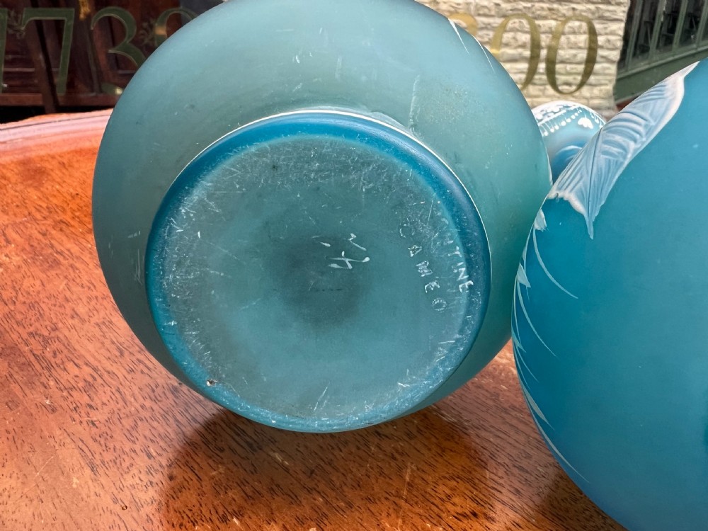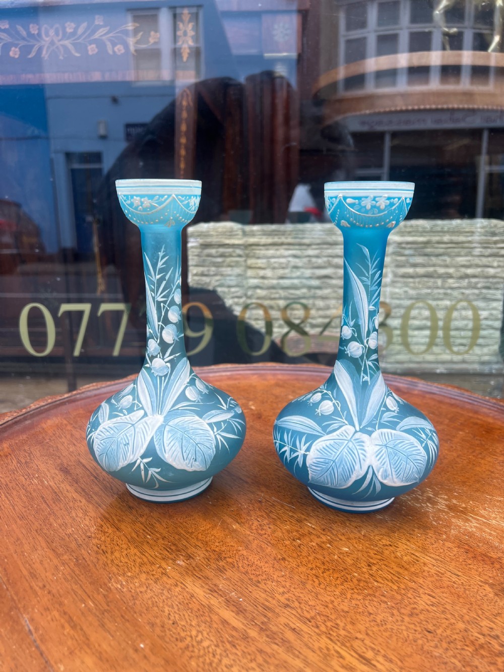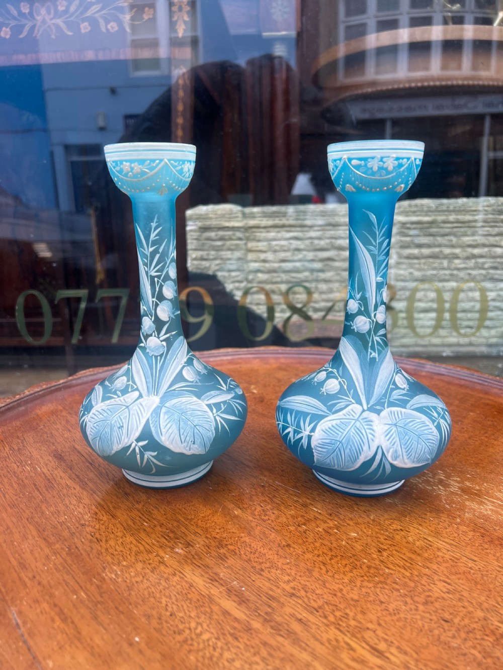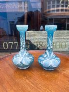 A pair of Thomas Webb and Co vases, blue glass with white cameo appliqué one marked on the base Florentine Cameo A very rare find and a pair Measures Height 20 cms Width 11 cms Condition Some very small bits of the white have been lost on the rim, but no chips to the glass or old breaks etc. One vase shows a few brown sections( photos) they are original and are in the glass and have an iridescence Delivery can easily be arranged for this item smaller items are generally sent free of charge to the uk, larger items can be sent via a courier, I keep this service as cheap as possible, the larger items are picked up and delivered to you within 7-10 days should you require a quicker delivery expect to pay at least double the normal cost. If you are unhappy with any item I offer a full money back guarantee once the item is safely back in my possession and undamaged as a result of misuse. Please feel free to ring me with any queries you may have, I'm always happy to discuss anything to do with antiques !! Opening hours Thursday to Saturday 10am - 6pm. Or by appointment.