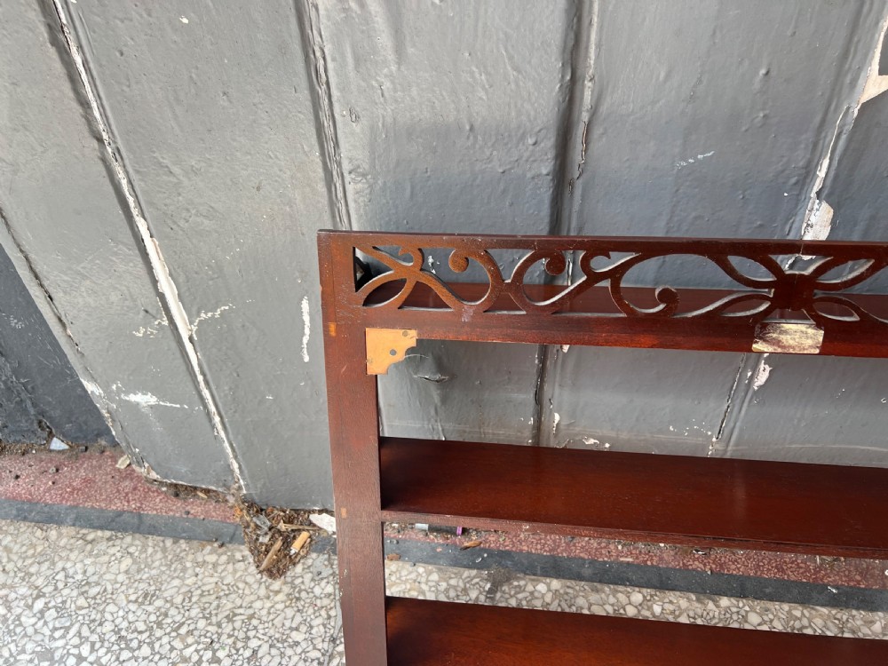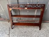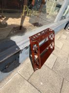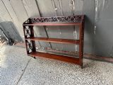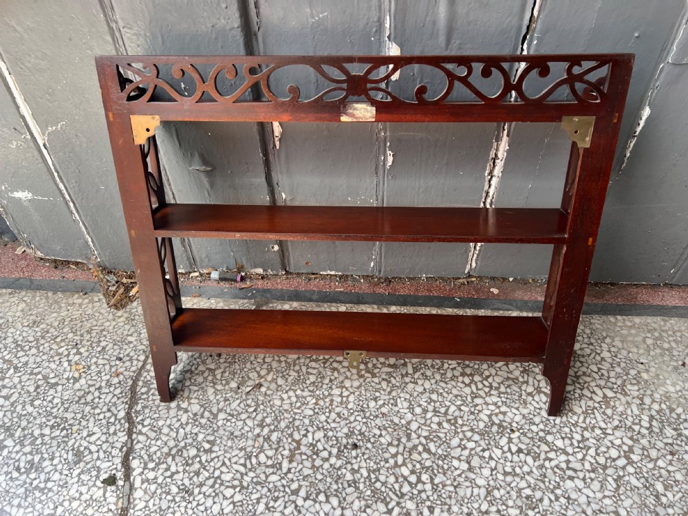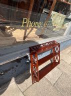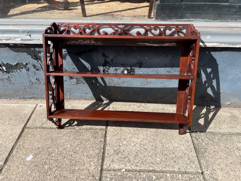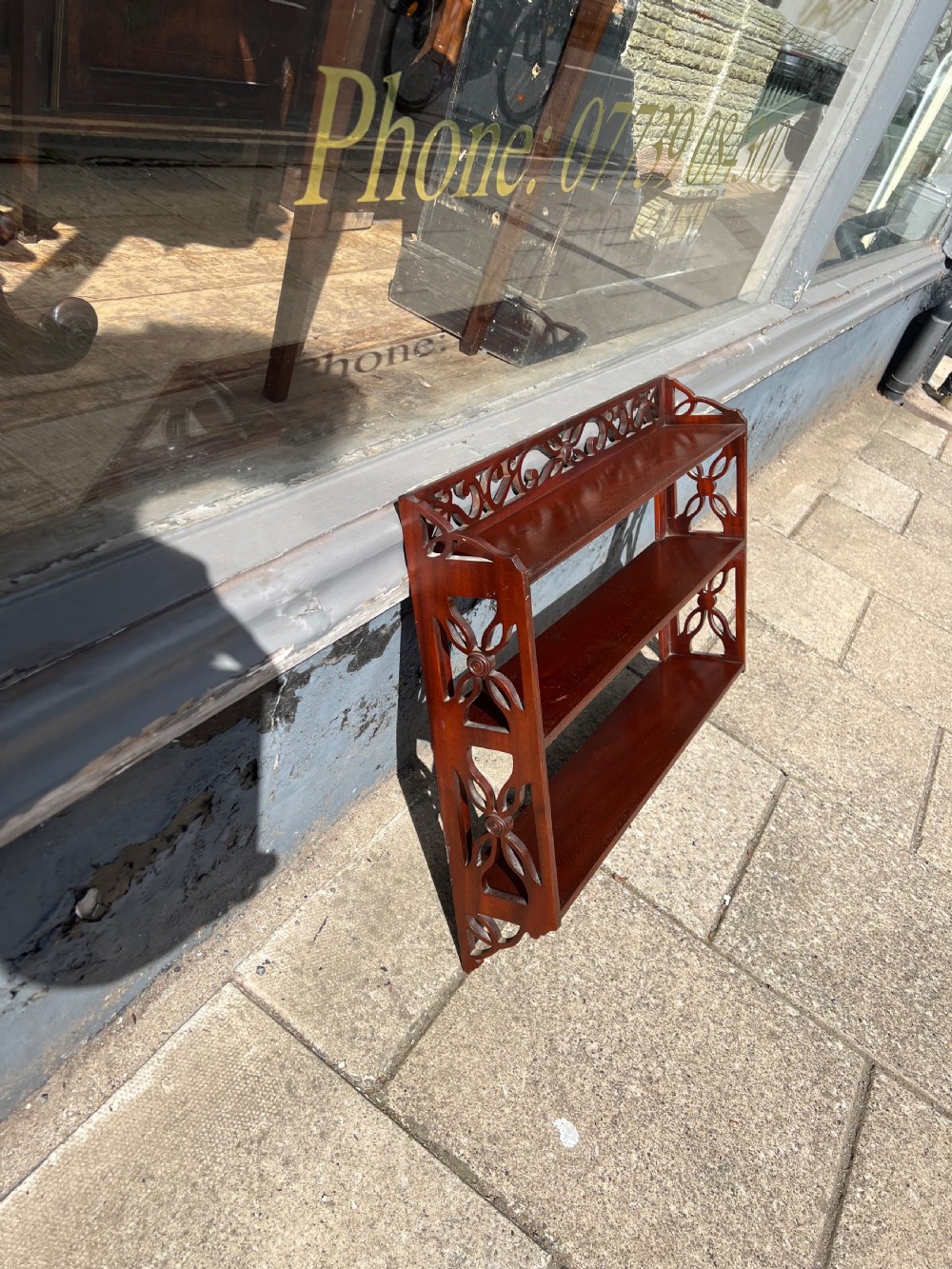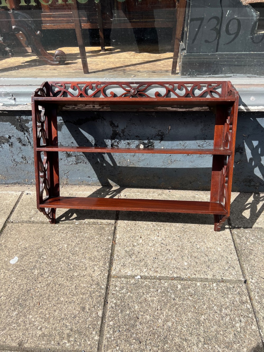 A C19th mahogany and fretwork wall mounted set of three shelves from the regency period Measuring Height 49 cms ( total ) Distance between shelves 17 cms and 14 cms Width 60 cms Depth 11 cms Condition Good, no damage to the fretwork Strong structure Delivery can easily be arranged for this item smaller items are generally sent free of charge to the uk, larger items can be sent via a courier, I keep this service as cheap as possible, the larger items are picked up and delivered to you within 7-10 days should you require a quicker delivery expect to pay at least double the normal cost. If you are unhappy with any item I offer a full money back guarantee once the item is safely back in my possession and undamaged as a result of misuse. Please feel free to ring me with any queries you may have, I'm always happy to discuss anything to do with antiques !! Opening hours Thursday to Saturday 10am - 6pm. Or by appointment.