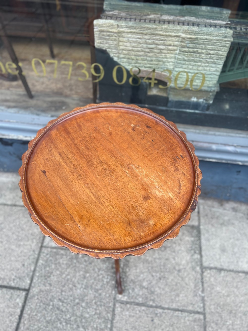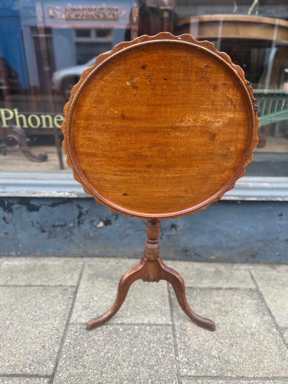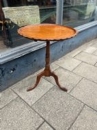 A mahogany tilt top circular tripod table, the edge of the top scalloped and with an inlay inset all around Measuring Height 68 cms Width 54 cms Condition Will be rewaxed polished before delivery Delivery can easily be arranged for this item smaller items are generally sent free of charge to the uk, larger items can be sent via a courier, I keep this service as cheap as possible, the larger items are picked up and delivered to you within 7-10 days should you require a quicker delivery expect to pay at least double the normal cost. If you are unhappy with any item I offer a full money back guarantee once the item is safely back in my possession and undamaged as a result of misuse. Please feel free to ring me with any queries you may have, I'm always happy to discuss anything to do with antiques !! Opening hours Thursday to Saturday 10am - 6pm. Or by appointment.