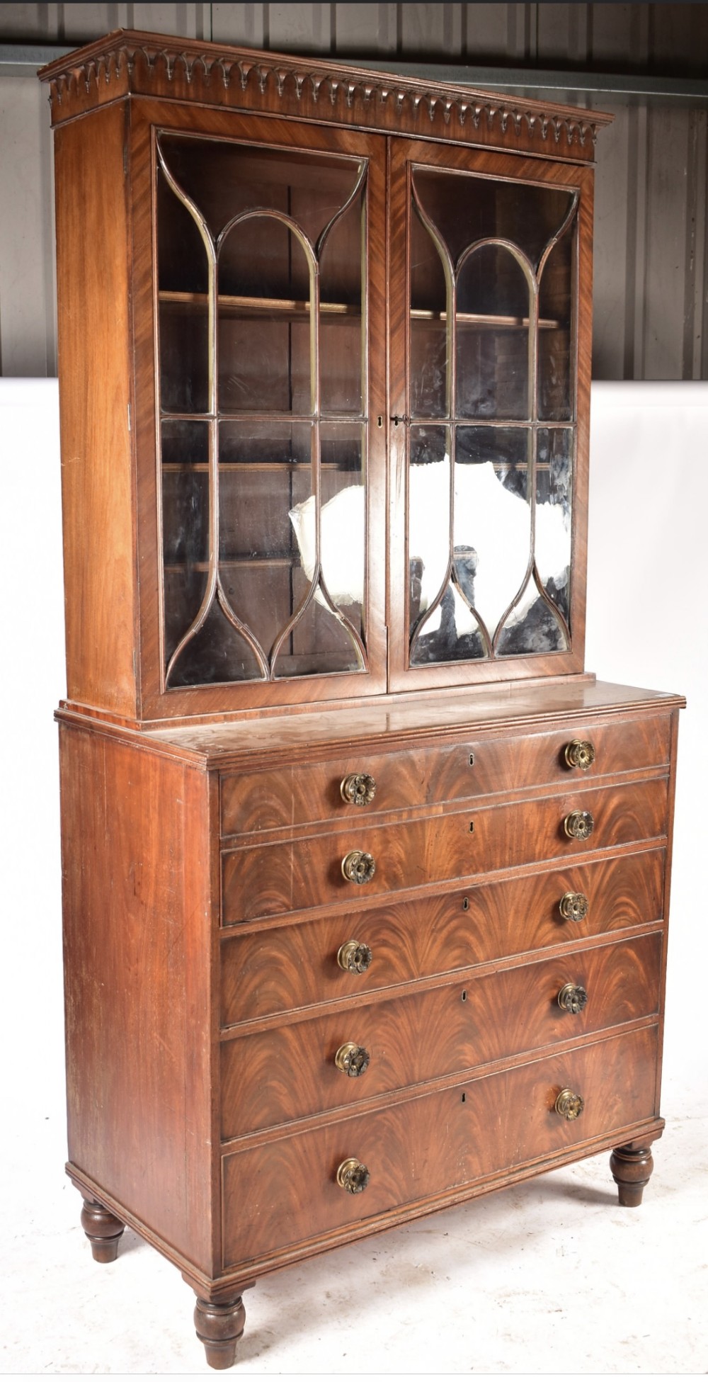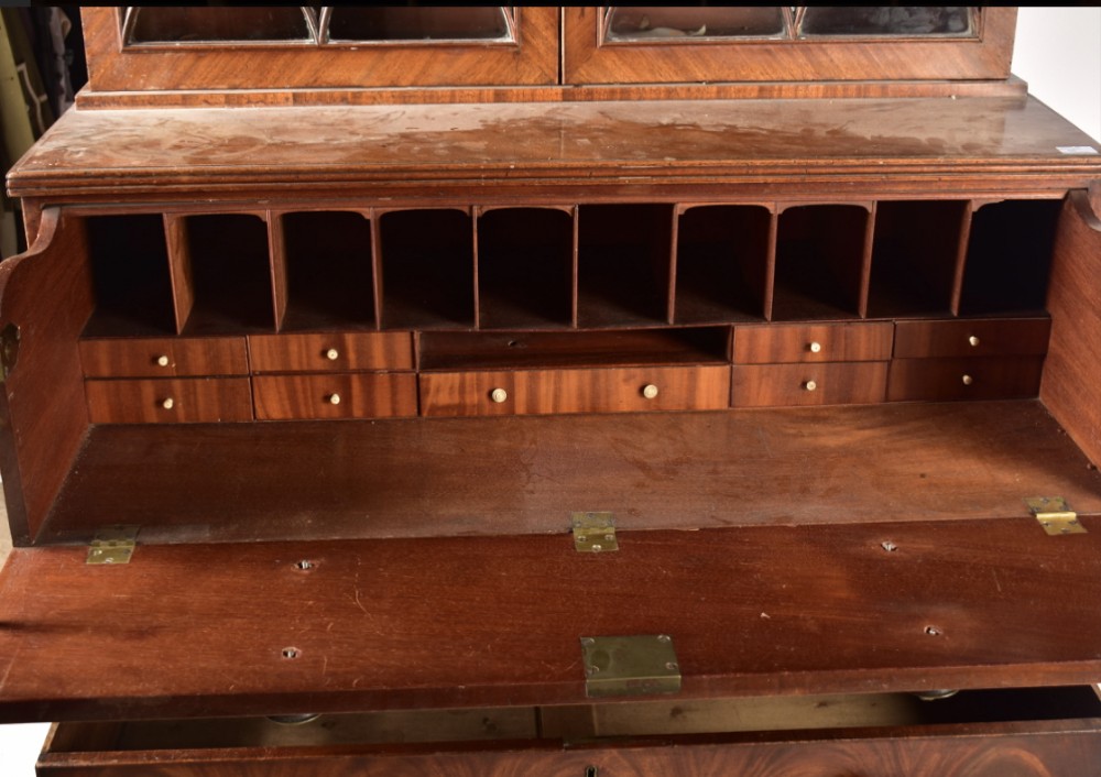 Early C19th George III flame mahogany secretaire bookcase. The bookcase having a caveto and turned cornice, over double astragal nine lane glazed doors revealing an interior with Three adjustable shelves. The base having a faux top drop down drawer opening to reveal a fully appointed interior with drawers & compartments, over a bank of three full length drawers with embossed brass pull handles. Raised on turned feet. In two pieces for transportation. By repute from the wills family estate a prominent family in bristol and patrons of the university and public buildings Measures approx. Height 210cm Width 115cm Depth 59cm. Condition Fresh in so needs a waxing and a few missing turnings on the cornice and a small amount of moulding in the doors and two cracked panes which will be replaced with period float glass all works will be carried out before delivery Delivery can easily be arranged for this item smaller items are generally sent free of charge to the uk, larger items can be sent via a courier, I keep this service as cheap as possible, the larger items are picked up and delivered to you within 7-10 days should you require a quicker delivery expect to pay at least double the normal cost. If you are unhappy with any item I offer a full money back guarantee once the item is safely back in my possession and undamaged as a result of misuse. Please feel free to ring me with any queries you may have, I'm always happy to discuss anything to do with antiques !! Opening hours Thursday to Saturday 10am - 6pm. Or by appointment.