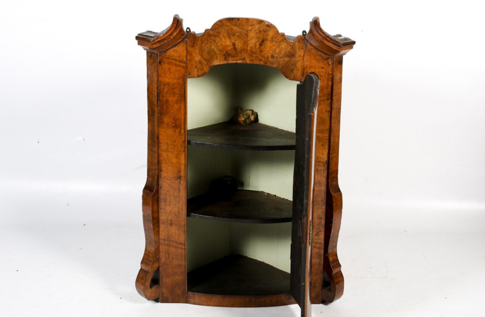 A continental C18th walnut hanging corner cabinet with broken pediment and applied shaped mouldings to sides Measuring H108cm x W75cm x D37cm Condition Good and is complete with key Delivery can easily be arranged for this item smaller items are generally sent free of charge to the uk, larger items can be sent via a courier, I keep this service as cheap as possible, the larger items are picked up and delivered to you within 7-10 days should you require a quicker delivery expect to pay at least double the normal cost. If you are unhappy with any item I offer a full money back guarantee once the item is safely back in my possession and undamaged as a result of misuse. Please feel free to ring me with any queries you may have, I'm always happy to discuss anything to do with antiques !! Opening hours Thursday to Saturday 10am - 6pm. Or by appointment.