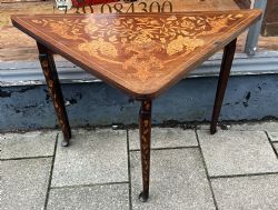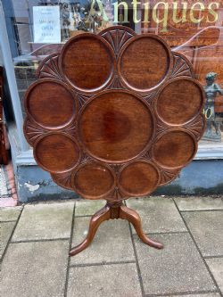 Antique tripod table, the base is in elm with an elegant turned leg and outswept cabriole legs the top which flips is mahogany and has a very unusual cut in its edge that simulates swags, just that little bit better than normal Measuring Height 66'cms Width 42 cms Depth 42 cms Condition Base is good, the top has old damage that's been repaired and the top has all sorts of marks, the base has some old treated worm holes. a very usable item though Delivery can easily be arranged for this item smaller items are generally sent free of charge to the uk, larger items can be sent via a courier, I keep this service as cheap as possible, the larger items are picked up and delivered to you within 7-10 days should you require a quicker delivery expect to pay at least double the normal cost. If you are unhappy with any item I offer a full money back guarantee once the item is safely back in my possession and undamaged as a result of misuse. Please feel free to ring me with any queries you may have, I'm always happy to discuss anything to do with antiques !! Opening hours Thursday to Saturday 10am - 6pm. Or by appointment.