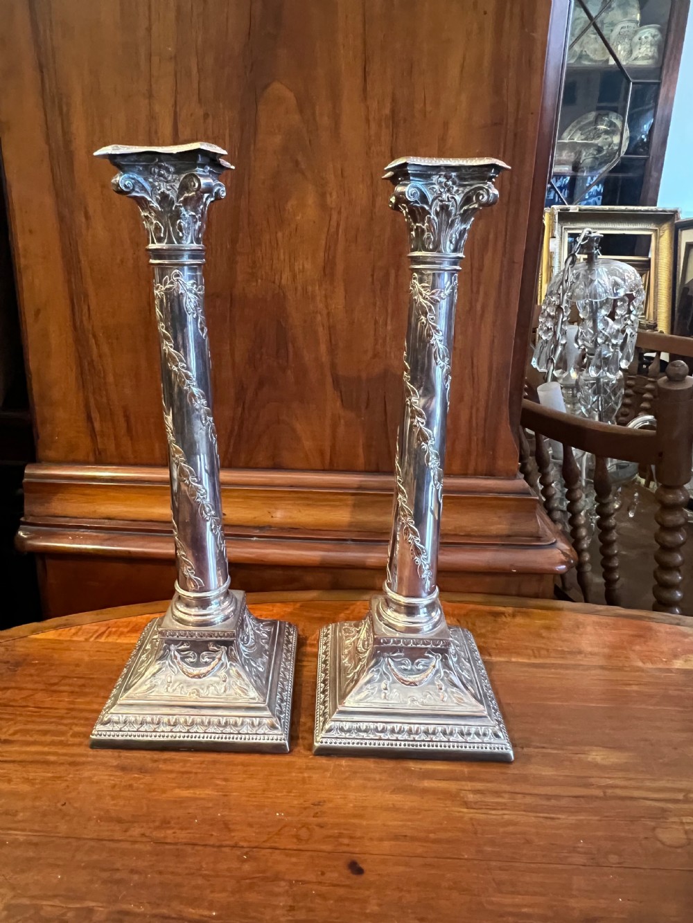 A pair of classical Corinthian candlesticks, copper and silver plate