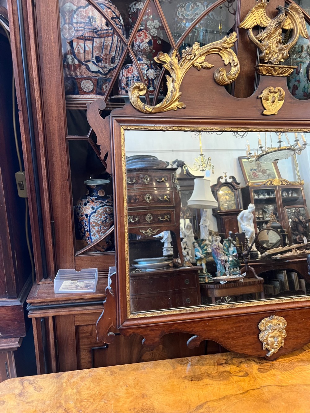 An Edwardian fretwork parcel gilt wall mirror in the Georgian style, decorated with decorated swan neck and surmounted by an eagle, the base has a classical face of a woman Measuring Height 76 cms Width 115 cms Condition Some old losses to the decoration Mirror good Delivery can easily be arranged for this item smaller items are generally sent free of charge to the uk, larger items can be sent via a courier, I keep this service as cheap as possible, the larger items are picked up and delivered to you within 7-10 days should you require a quicker delivery expect to pay at least double the normal cost. If you are unhappy with any item I offer a full money back guarantee once the item is safely back in my possession and undamaged as a result of misuse. Please feel free to ring me with any queries you may have, I'm always happy to discuss anything to do with antiques !! Opening hours Thursday to Saturday 10am - 6pm. Or by appointment.