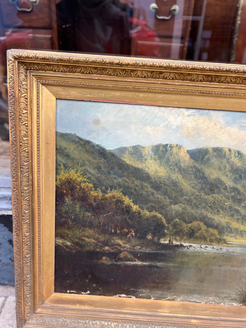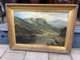 A fine and large oil painting on canvas of a highland scene by the landscape painter William Langley ( 1852-1922) Set in a gilded frame Measuring in frame Height 82 cms Width 112 cms Condition Original, but requires some touch ups and a little paint flaking at the very bottom edge of the painting and there is a tiny tear but not really noticeable from the front, also what looks like some earlier restored spots Delivery can easily be arranged for this item smaller items are generally sent free of charge to the uk, larger items can be sent via a courier, I keep this service as cheap as possible, the larger items are picked up and delivered to you within 7-10 days should you require a quicker delivery expect to pay at least double the normal cost. If you are unhappy with any item I offer a full money back guarantee once the item is safely back in my possession and undamaged as a result of misuse. Please feel free to ring me with any queries you may have, I'm always happy to discuss anything to do with antiques !! Opening hours Thursday to Saturday 10am - 6pm. Or by appointment.