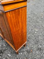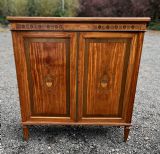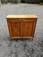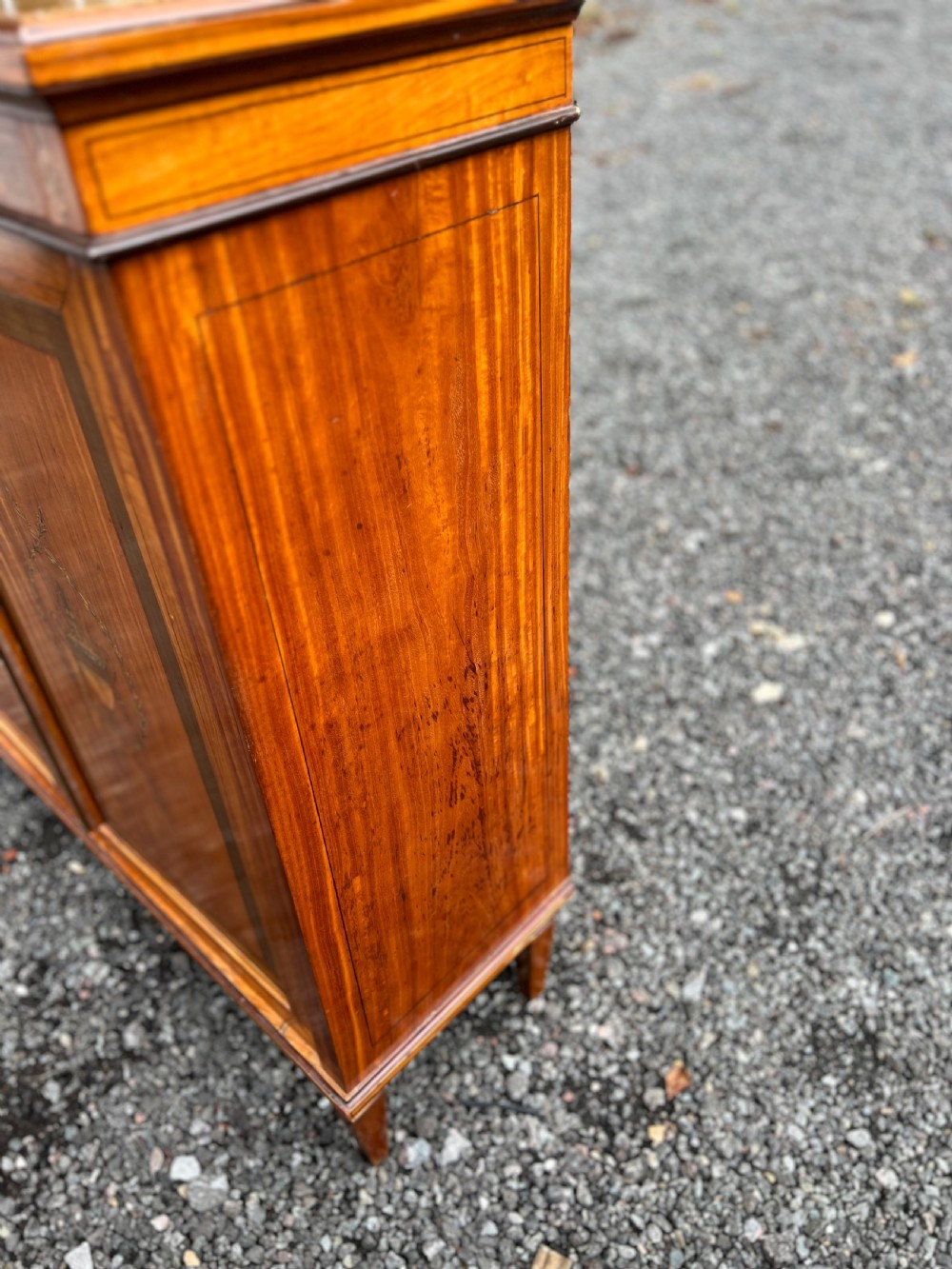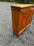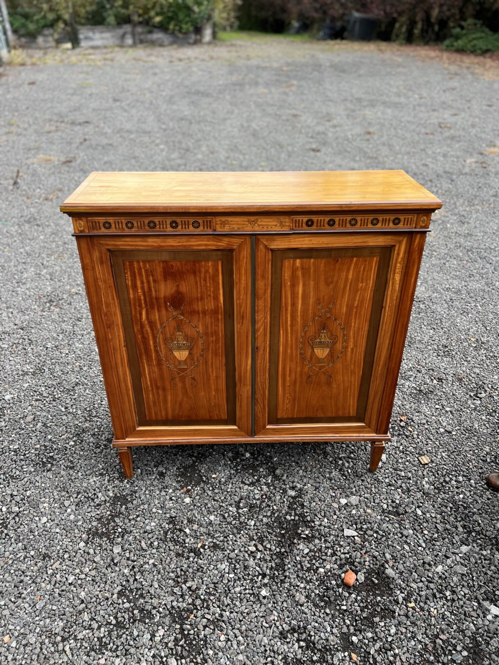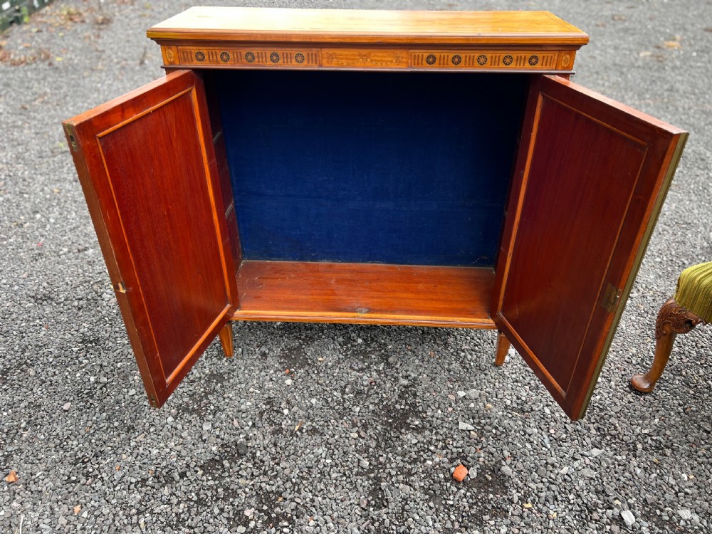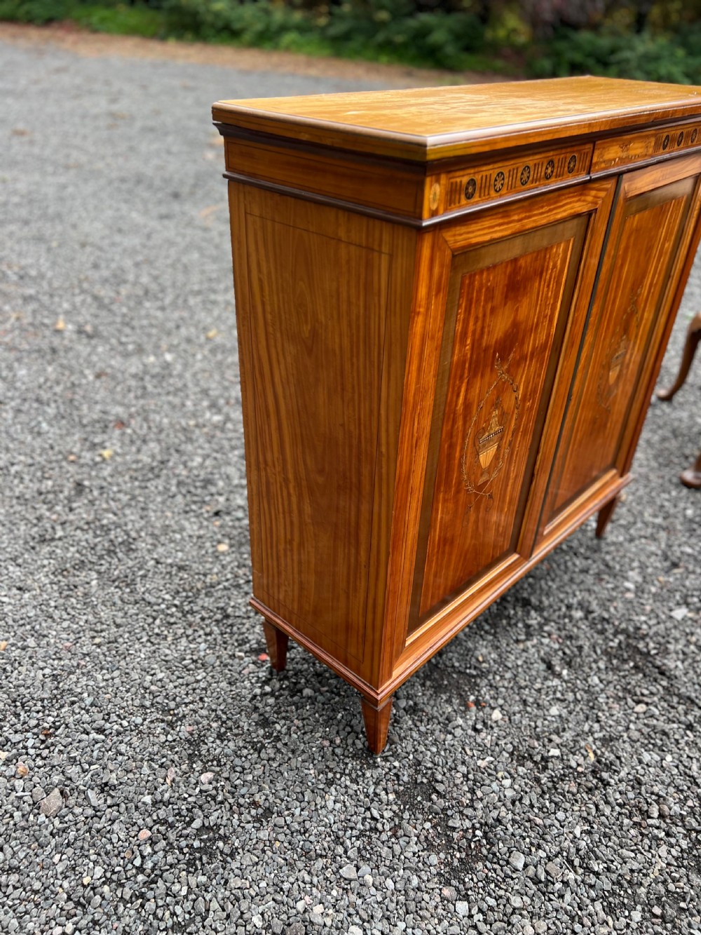 Sheraton revival satinwood side cabinet, the rectangular top with thumb moulded edge over a marquetry inlaid frieze, the two panel doors inlaid with urns, on square tapering legs, Measuring Height 105cm Width 101cm Depth 34cm deep Condition Good overall the internal cupboard has two shelves not shown in picture Delivery can easily be arranged for this item smaller items are generally sent free of charge to the uk, larger items can be sent via a courier, I keep this service as cheap as possible, the larger items are picked up and delivered to you within 7-10 days should you require a quicker delivery expect to pay at least double the normal cost. If you are unhappy with any item I offer a full money back guarantee once the item is safely back in my possession and undamaged as a result of misuse. Please feel free to ring me with any queries you may have, I'm always happy to discuss anything to do with antiques !! Opening hours Thursday to Saturday 10am - 6pm. Or by appointment.