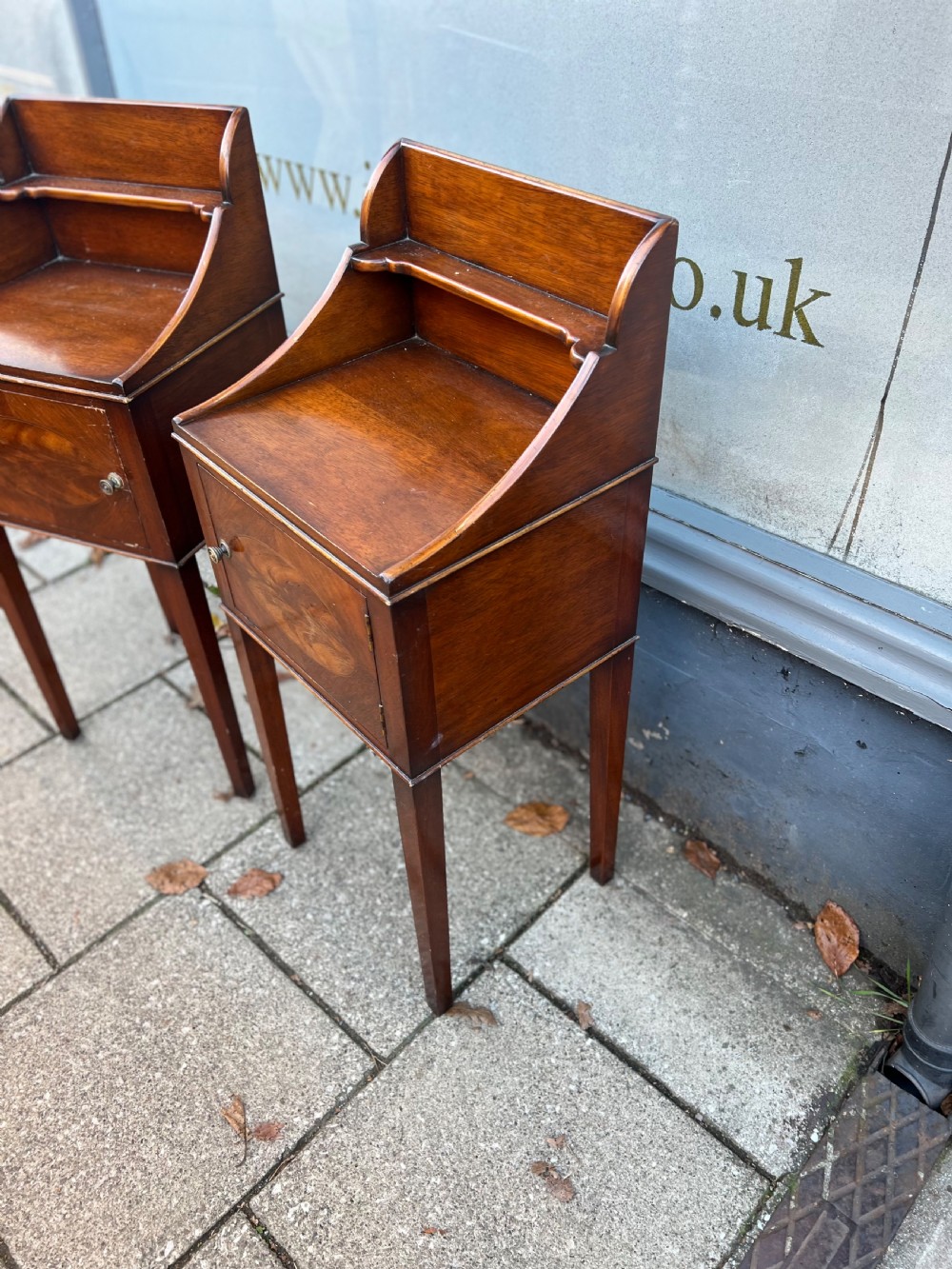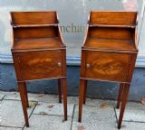 A pair of Edwardian bedside cabinets in the Georgian taste, with opening doors, they are mahogany and then a flame mahogany door with an oval inlayed panel on four tapering legs and with a upstand, each with a brass pull handle Measuring Height 102 cm Width 39 cm Depth 36 cm Condition Good, will be waxed polished prior to delivery Delivery can easily be arranged for this item smaller items are generally sent free of charge to the uk, larger items can be sent via a courier, I keep this service as cheap as possible, the larger items are picked up and delivered to you within 7-10 days should you require a quicker delivery expect to pay at least double the normal cost. If you are unhappy with any item I offer a full money back guarantee once the item is safely back in my possession and undamaged as a result of misuse. Please feel free to ring me with any queries you may have, I'm always happy to discuss anything to do with antiques !! Opening hours Thursday to Saturday 10am - 6pm. Or by appointment.