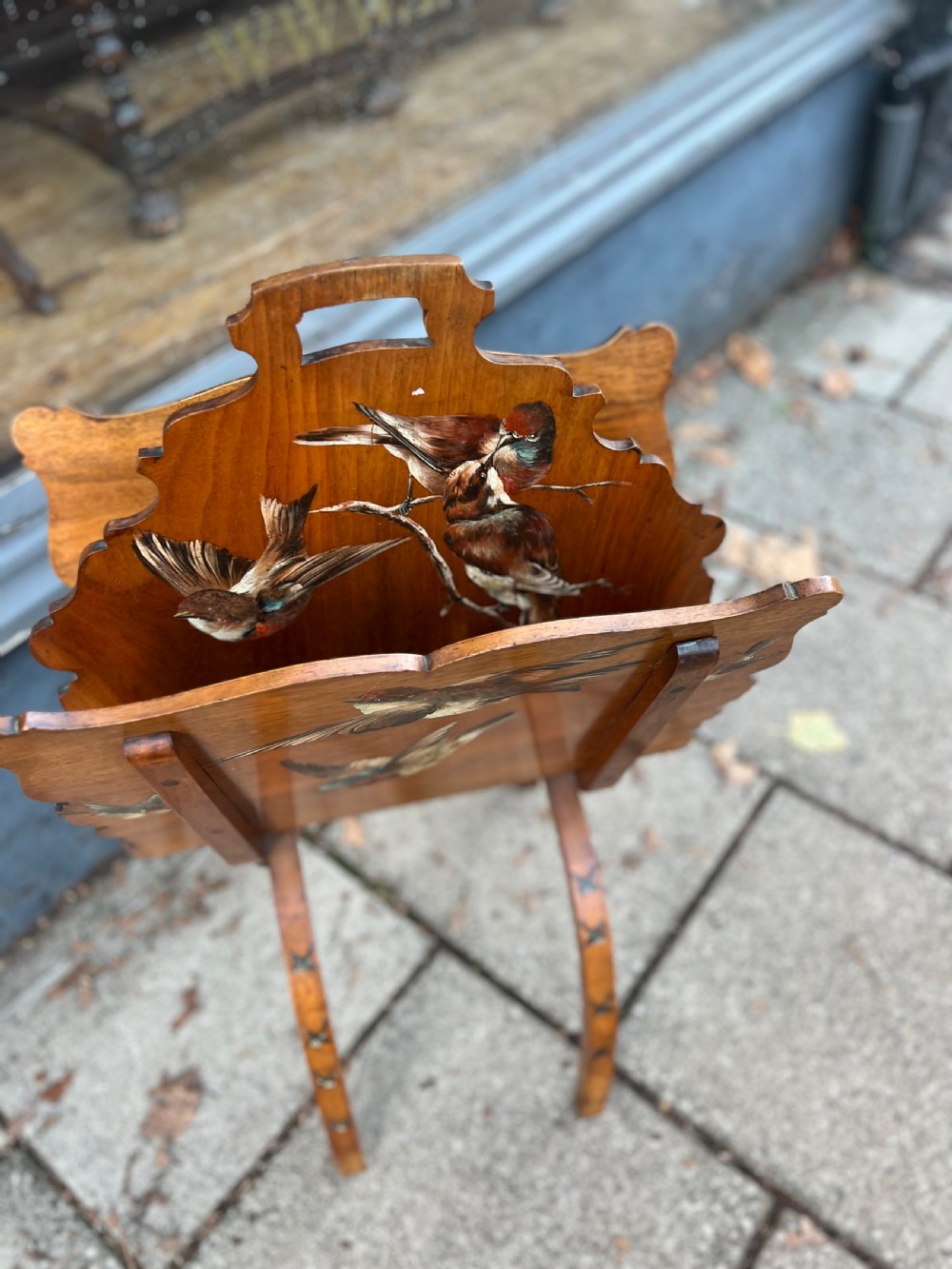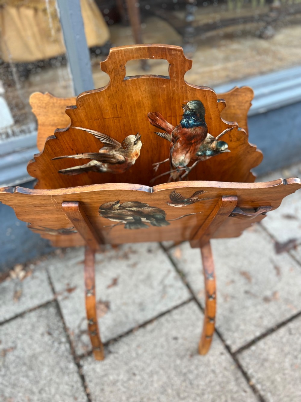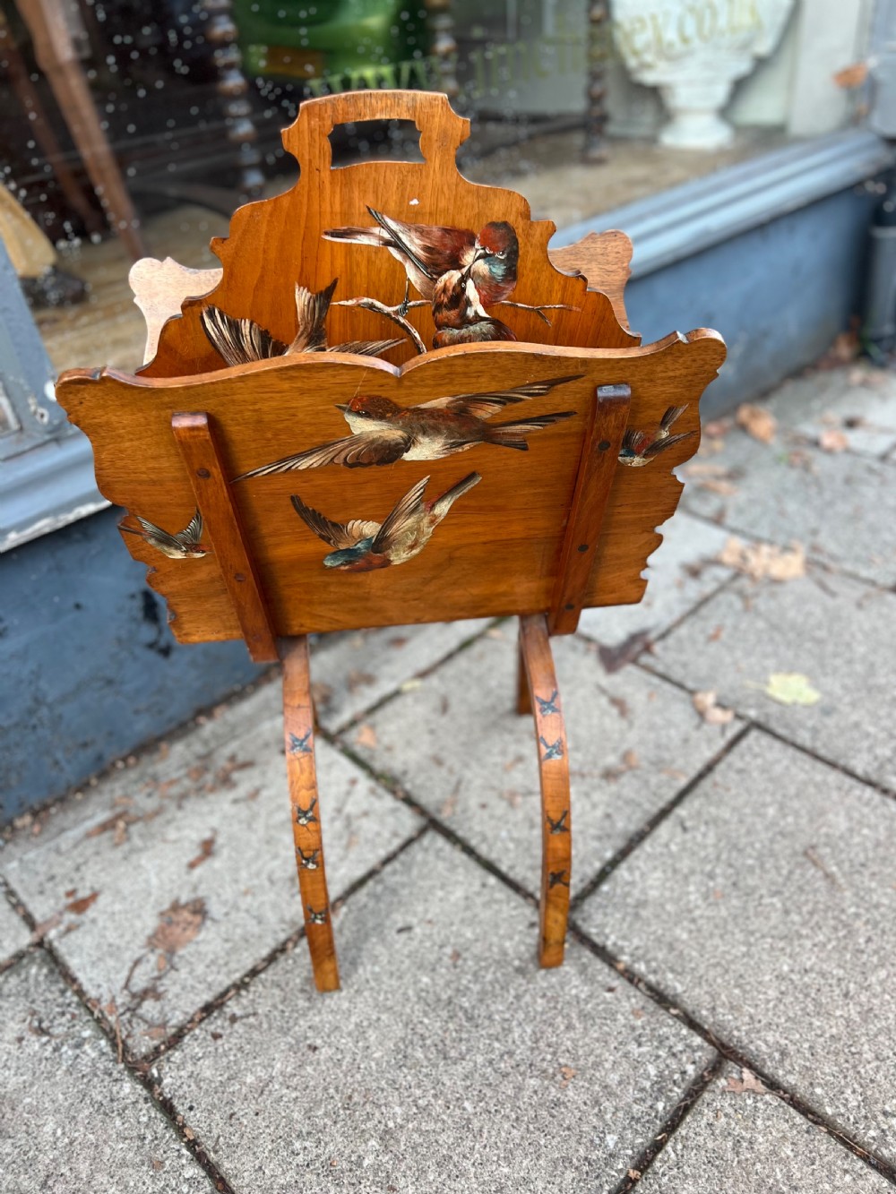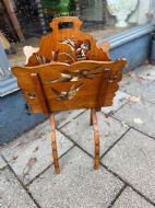 C19th walnut fold up magazine rack hand painted with birds, it has two sections and a carrying handle cut into the wood, the curved legs continuing the bird painted theme Measuring (open) Height 80 cms Width 46 cms Depth 40 cms Condition Good overall some small scratches on the painted birds but nothing serious please refer to pictures Delivery can easily be arranged for this item smaller items are generally sent free of charge to the uk, larger items can be sent via a courier, I keep this service as cheap as possible, the larger items are picked up and delivered to you within 7-10 days should you require a quicker delivery expect to pay at least double the normal cost. If you are unhappy with any item I offer a full money back guarantee once the item is safely back in my possession and undamaged as a result of misuse. Please feel free to ring me with any queries you may have, I'm always happy to discuss anything to do with antiques !! Opening hours Thursday to Saturday 10am - 6pm. Or by appointment.
