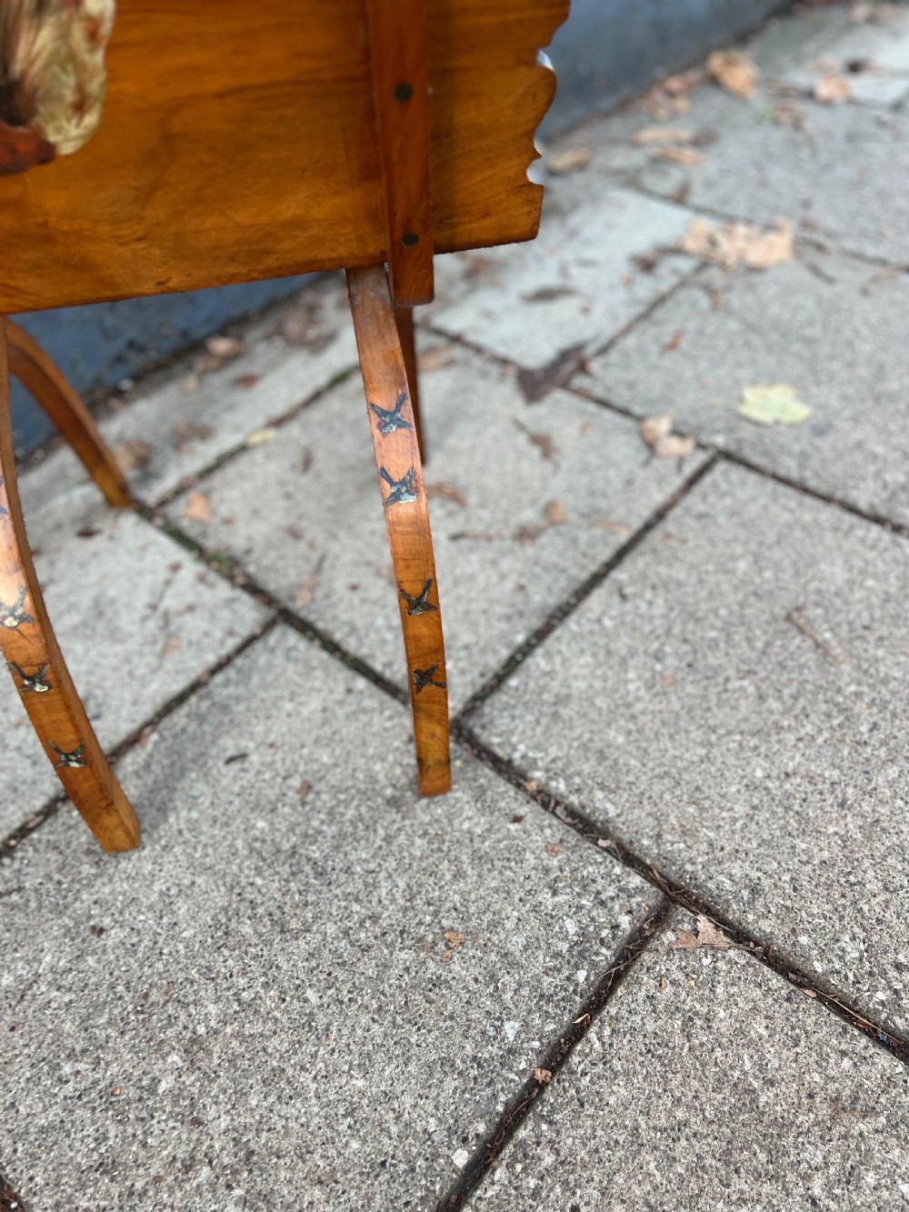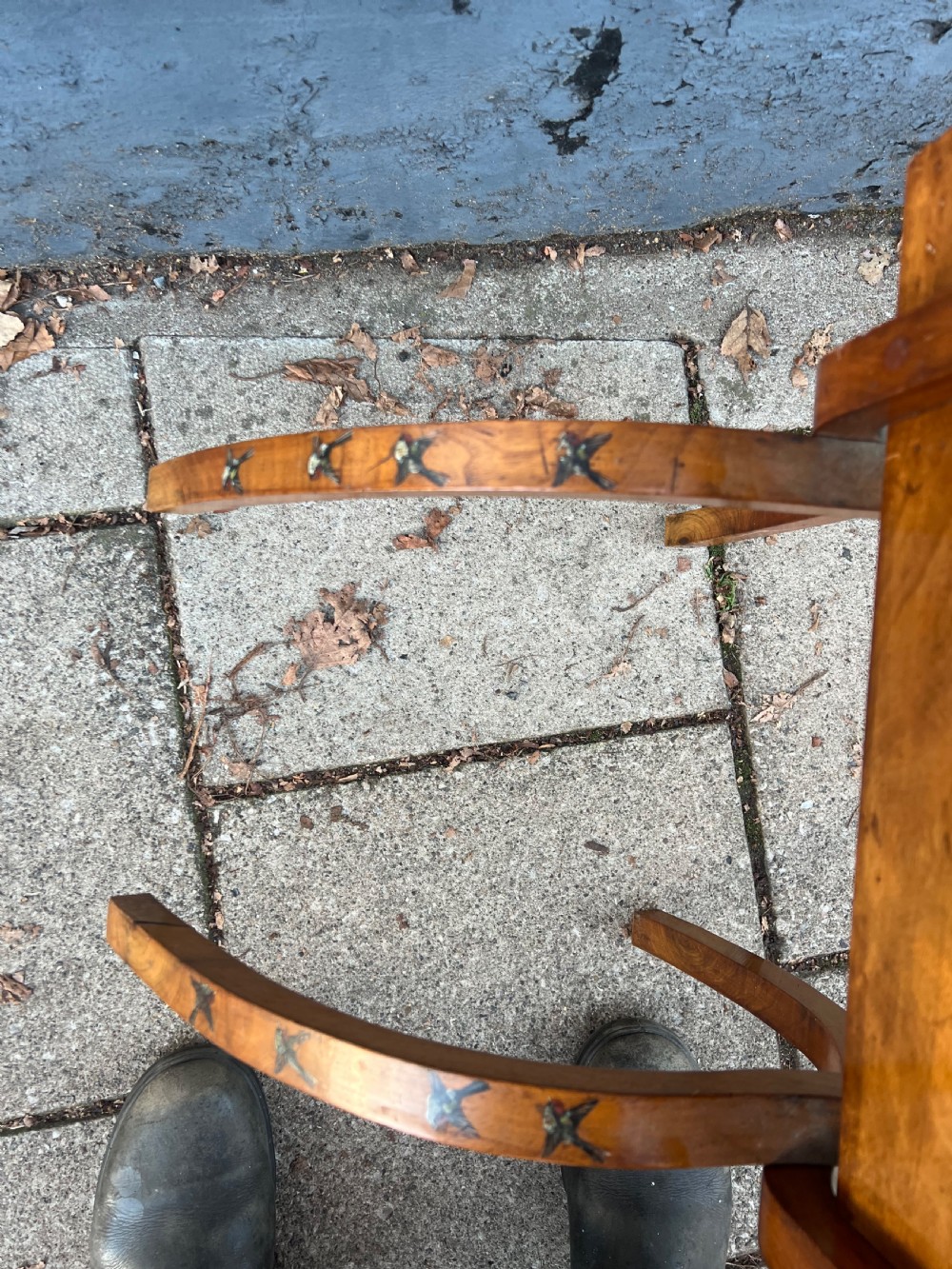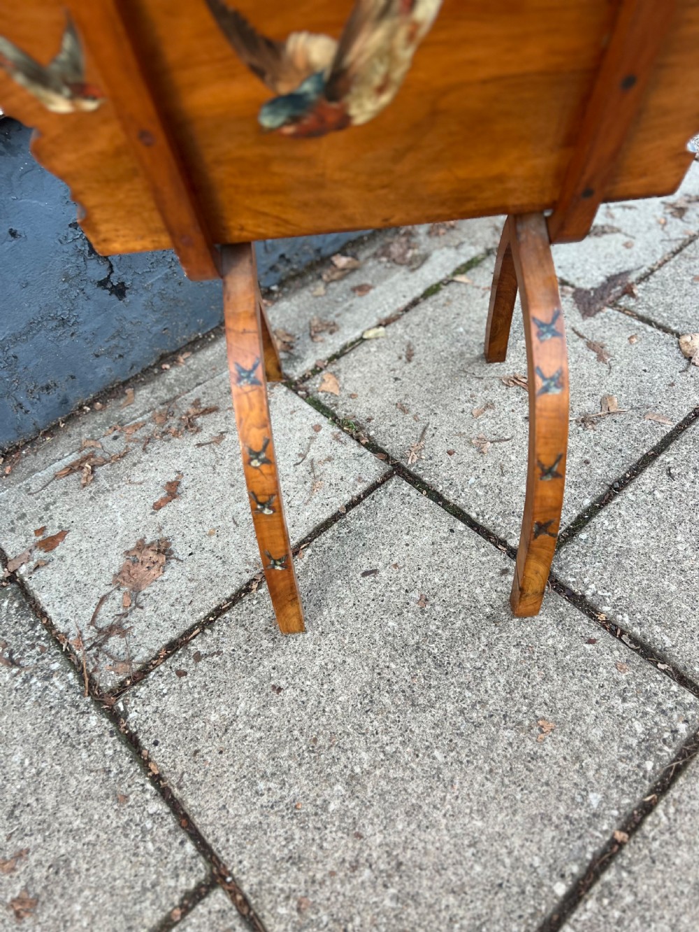 C19th walnut fold up magazine rack hand painted with birds, it has two sections and a carrying handle cut into the wood, the curved legs continuing the bird painted theme Measuring (open) Height 80 cms Width 46 cms Depth 40 cms Condition Good overall some small scratches on the painted birds but nothing serious please refer to pictures Delivery can easily be arranged for this item smaller items are generally sent free of charge to the uk, larger items can be sent via a courier, I keep this service as cheap as possible, the larger items are picked up and delivered to you within 7-10 days should you require a quicker delivery expect to pay at least double the normal cost. If you are unhappy with any item I offer a full money back guarantee once the item is safely back in my possession and undamaged as a result of misuse. Please feel free to ring me with any queries you may have, I'm always happy to discuss anything to do with antiques !! Opening hours Thursday to Saturday 10am - 6pm. Or by appointment.