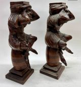 C19th Pair Of Hand Carved Wooden Figures resembling jesters Sitting On Barrels. Measuring Height 43cm Width 14cms Condition Good Delivery can easily be arranged for this item smaller items are generally sent free of charge to the uk, larger items can be sent via a courier, I keep this service as cheap as possible, the larger items are picked up and delivered to you within 7-10 days should you require a quicker delivery expect to pay at least double the normal cost. If you are unhappy with any item I offer a full money back guarantee once the item is safely back in my possession and undamaged as a result of misuse. Please feel free to ring me with any queries you may have, I'm always happy to discuss anything to do with antiques !! Opening hours Thursday to Saturday 10am - 6pm. Or by appointment.