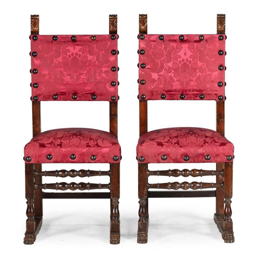 A pair of 18th century Italian walnut and upholstered side chairs Measuring Height 110cms Width 49 cms Depth 55cms Condition Good overalls treated worm holes on the backs but still completely strong and solid Delivery can easily be arranged for this item smaller items are generally sent free of charge to the uk, larger items can be sent via a courier, I keep this service as cheap as possible, the larger items are picked up and delivered to you within 7-10 days should you require a quicker delivery expect to pay at least double the normal cost. If you are unhappy with any item I offer a full money back guarantee once the item is safely back in my possession and undamaged as a result of misuse. Please feel free to ring me with any queries you may have, I'm always happy to discuss anything to do with antiques !! Opening hours Thursday to Saturday 10am - 6pm. Or by appointment.