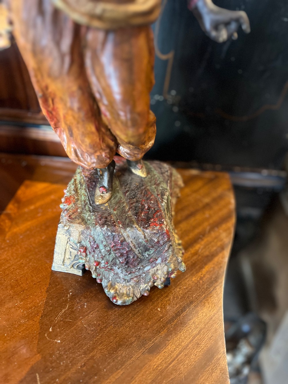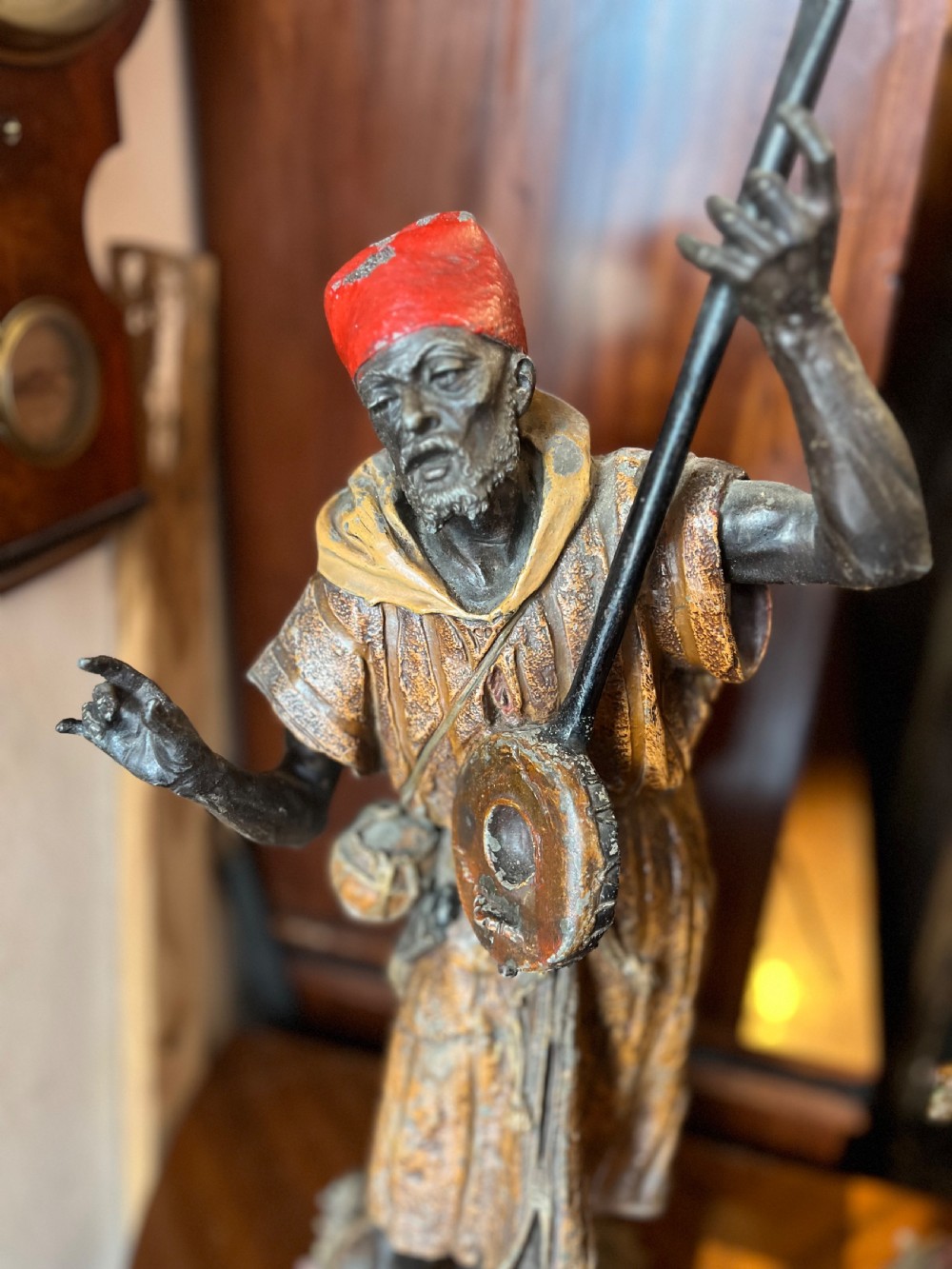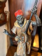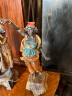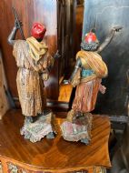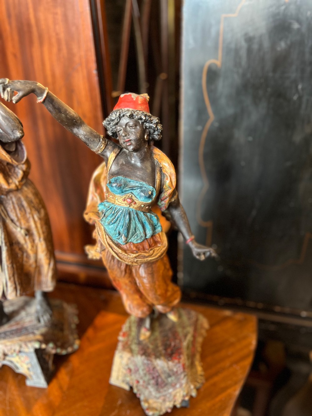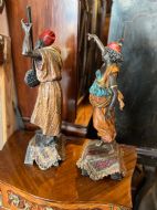 Pair of large painted spelter figures depicting a moorish musician and dancer, in very detailed form Measuring Height 60 cms Width 22cms Depth 22cms Condition Arms repaired on lady Delivery can easily be arranged for this item smaller items are generally sent free of charge to the uk, larger items can be sent via a courier, I keep this service as cheap as possible, the larger items are picked up and delivered to you within 7-10 days should you require a quicker delivery expect to pay at least double the normal cost. If you are unhappy with any item I offer a full money back guarantee once the item is safely back in my possession and undamaged as a result of misuse. Please feel free to ring me with any queries you may have, I'm always happy to discuss anything to do with antiques !! Opening hours Thursday to Saturday 10am - 6pm. Or by appointment.