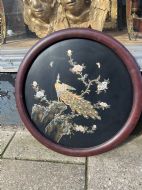 A pair of Japanese lacquered roundels, one featuring an eagle and a monkey the other a peacock beautifully picked out in mother of pearl and abalone shells