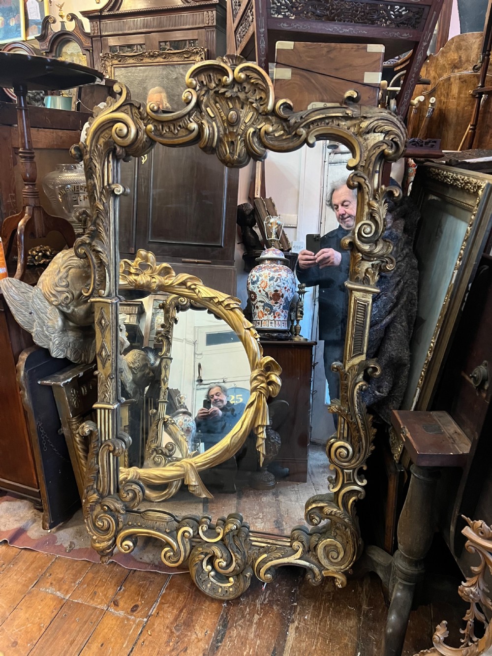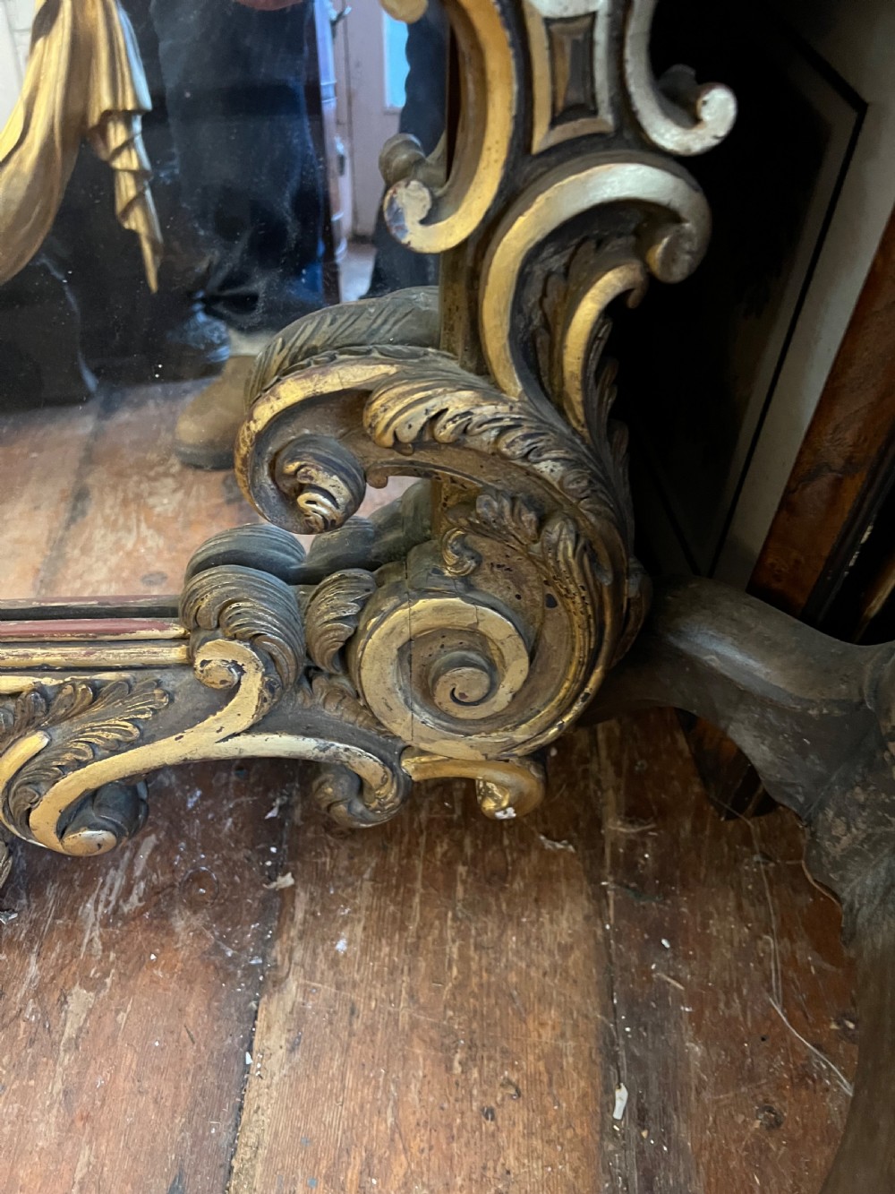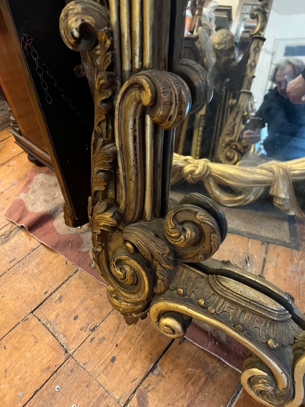 Large rococo influenced pier mirror, carved wood and then gilded and highlighted, good deep carving. Measuring Height 155 cms Width 88 cms Condition Good, wear associated with age but original gilt Delivery can easily be arranged for this item smaller items are generally sent free of charge to the uk, larger items can be sent via a courier, I keep this service as cheap as possible, the larger items are picked up and delivered to you within 7-10 days should you require a quicker delivery expect to pay at least double the normal cost. If you are unhappy with any item I offer a full money back guarantee once the item is safely back in my possession and undamaged as a result of misuse. Please feel free to ring me with any queries you may have, I'm always happy to discuss anything to do with antiques !! Opening hours Thursday to Saturday 10am - 6pm. Or by appointment.