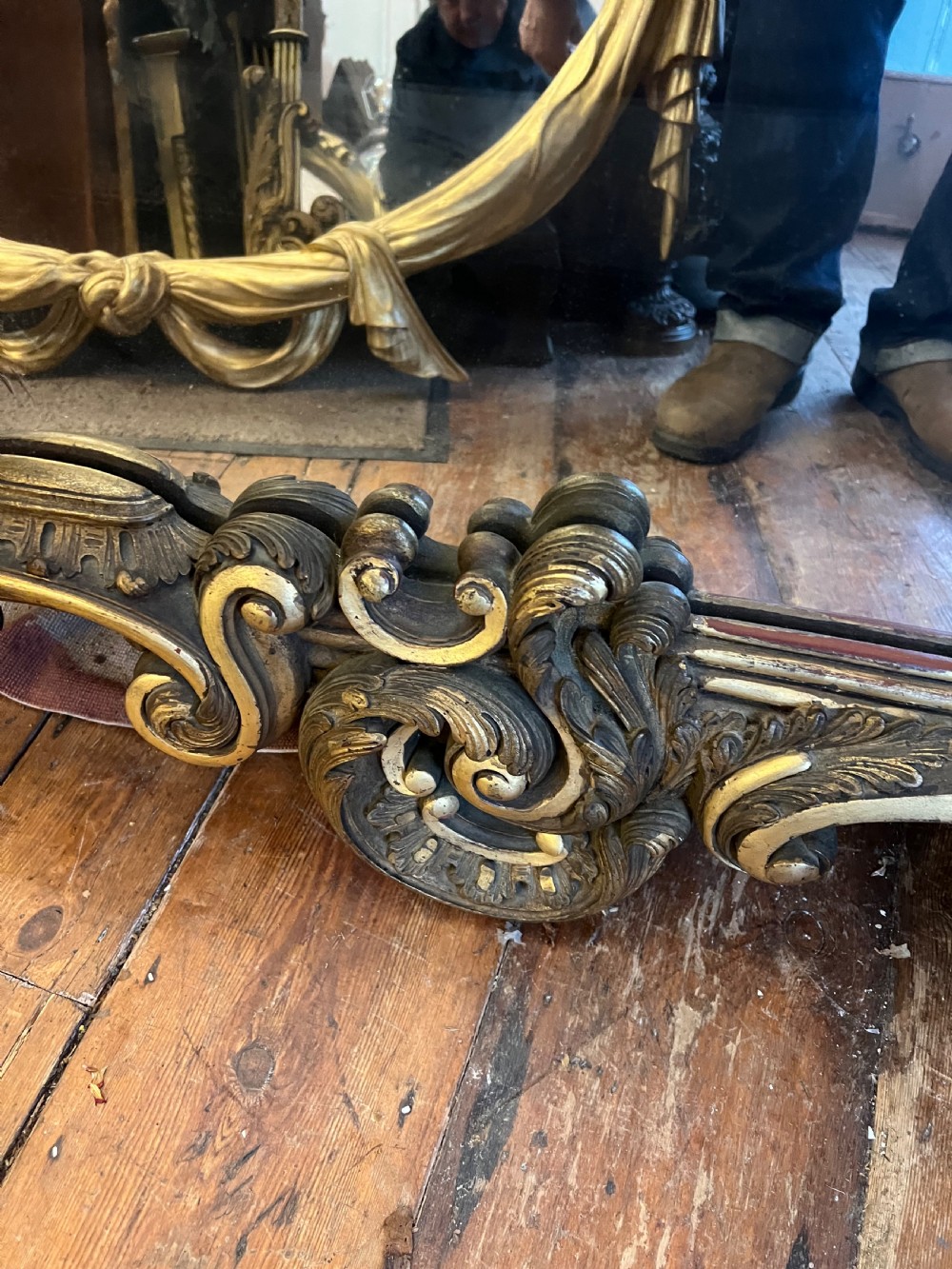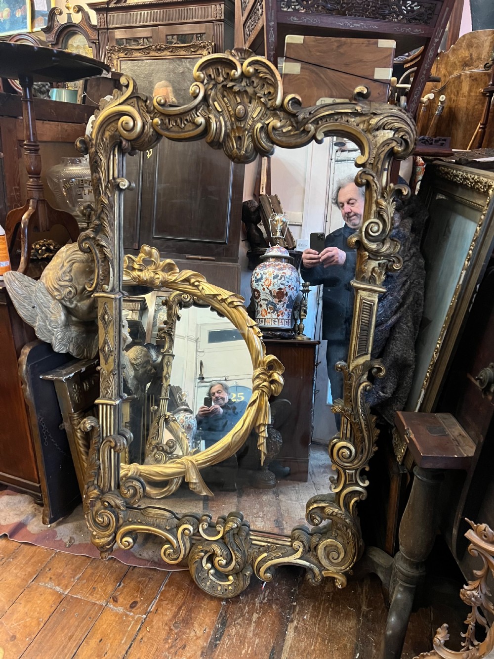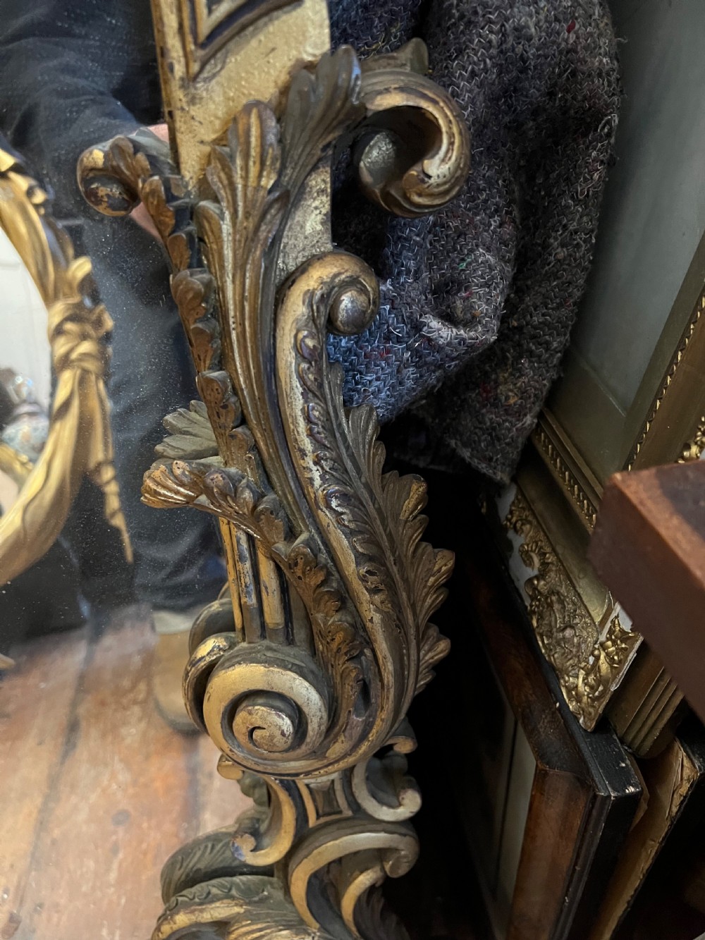 Large rococo influenced pier mirror, carved wood and then gilded and highlighted, good deep carving. Measuring Height 155 cms Width 88 cms Condition Good, wear associated with age but original gilt Delivery can easily be arranged for this item smaller items are generally sent free of charge to the uk, larger items can be sent via a courier, I keep this service as cheap as possible, the larger items are picked up and delivered to you within 7-10 days should you require a quicker delivery expect to pay at least double the normal cost. If you are unhappy with any item I offer a full money back guarantee once the item is safely back in my possession and undamaged as a result of misuse. Please feel free to ring me with any queries you may have, I'm always happy to discuss anything to do with antiques !! Opening hours Thursday to Saturday 10am - 6pm. Or by appointment.