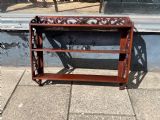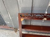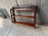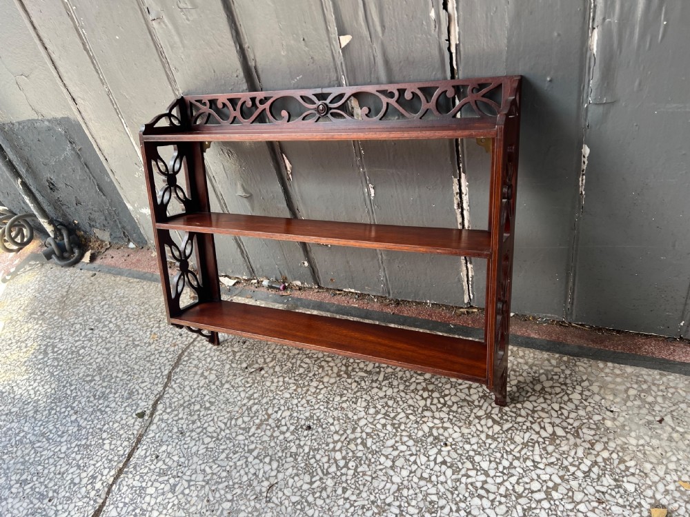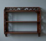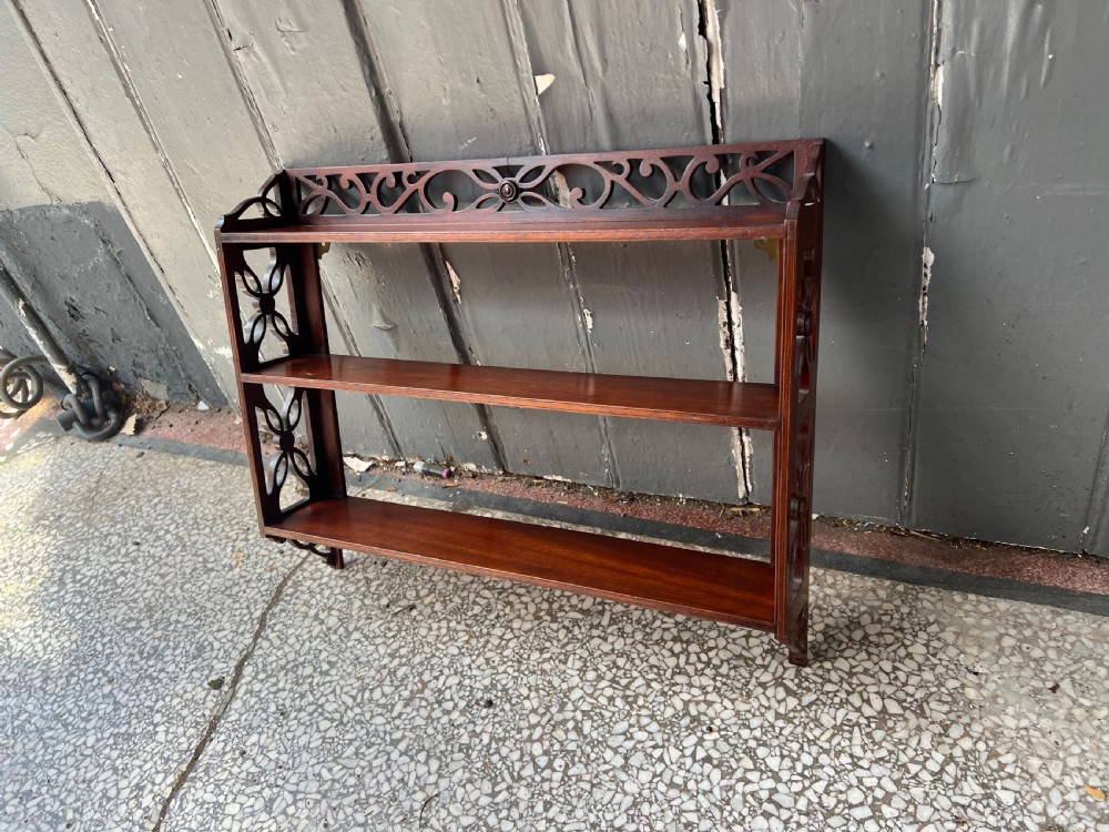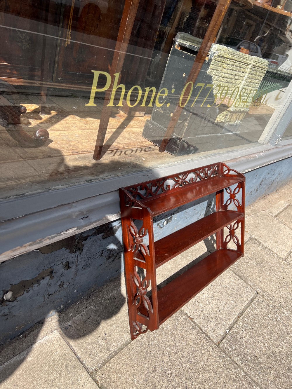 A C19th mahogany and fretwork wall mounted set of three shelves from the regency period Measuring Height 49 cms ( total ) Distance between shelves 17 cms and 14 cms Width 60 cms Depth 11 cms Condition Good, no damage to the fretwork Strong structure Delivery can easily be arranged for this item smaller items are generally sent free of charge to the uk, larger items can be sent via a courier, I keep this service as cheap as possible, the larger items are picked up and delivered to you within 7-10 days should you require a quicker delivery expect to pay at least double the normal cost. If you are unhappy with any item I offer a full money back guarantee once the item is safely back in my possession and undamaged as a result of misuse. Please feel free to ring me with any queries you may have, I'm always happy to discuss anything to do with antiques !! Opening hours Thursday to Saturday 10am - 6pm. Or by appointment.