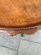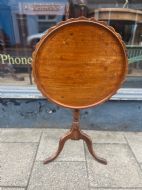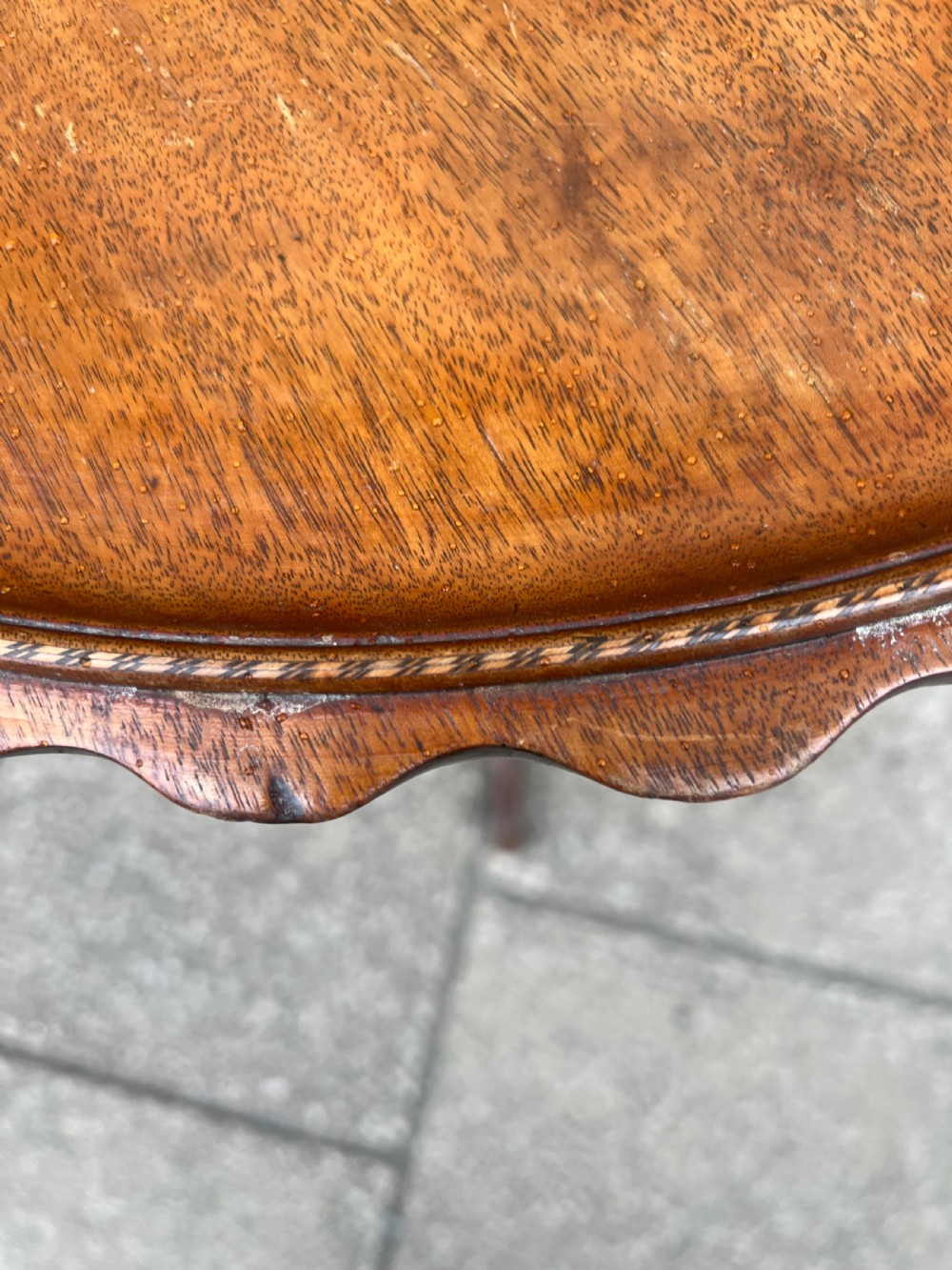 A mahogany tilt top circular tripod table, the edge of the top scalloped and with an inlay inset all around Measuring Height 68 cms Width 54 cms Condition Will be rewaxed polished before delivery Delivery can easily be arranged for this item smaller items are generally sent free of charge to the uk, larger items can be sent via a courier, I keep this service as cheap as possible, the larger items are picked up and delivered to you within 7-10 days should you require a quicker delivery expect to pay at least double the normal cost. If you are unhappy with any item I offer a full money back guarantee once the item is safely back in my possession and undamaged as a result of misuse. Please feel free to ring me with any queries you may have, I'm always happy to discuss anything to do with antiques !! Opening hours Thursday to Saturday 10am - 6pm. Or by appointment.