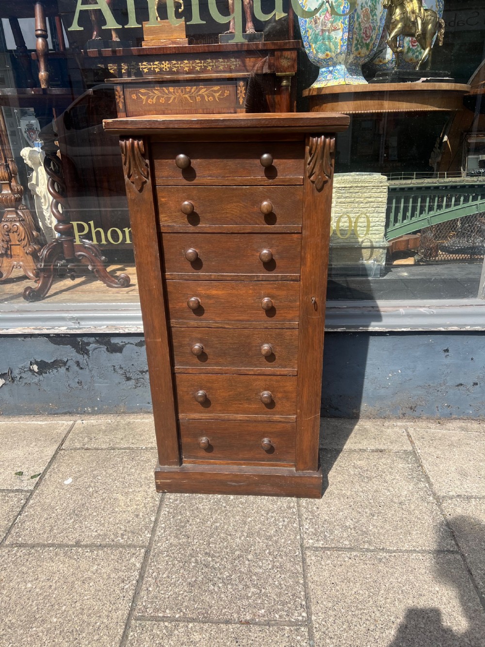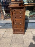 A Victorian oak Wellington chest with side lock mechanism and seven drawers Height 103 cms Width 51 cms Depth 35 cms Condition Maintains its original colour although the top has been sanded and repolished, retains its original lock and key Delivery can easily be arranged for this item smaller items are generally sent free of charge to the uk, larger items can be sent via a courier, I keep this service as cheap as possible, the larger items are picked up and delivered to you within 7-10 days should you require a quicker delivery expect to pay at least double the normal cost. If you are unhappy with any item I offer a full money back guarantee once the item is safely back in my possession and undamaged as a result of misuse. Please feel free to ring me with any queries you may have, I'm always happy to discuss anything to do with antiques !! Opening hours Thursday to Saturday 10am - 6pm. Or by appointment.
