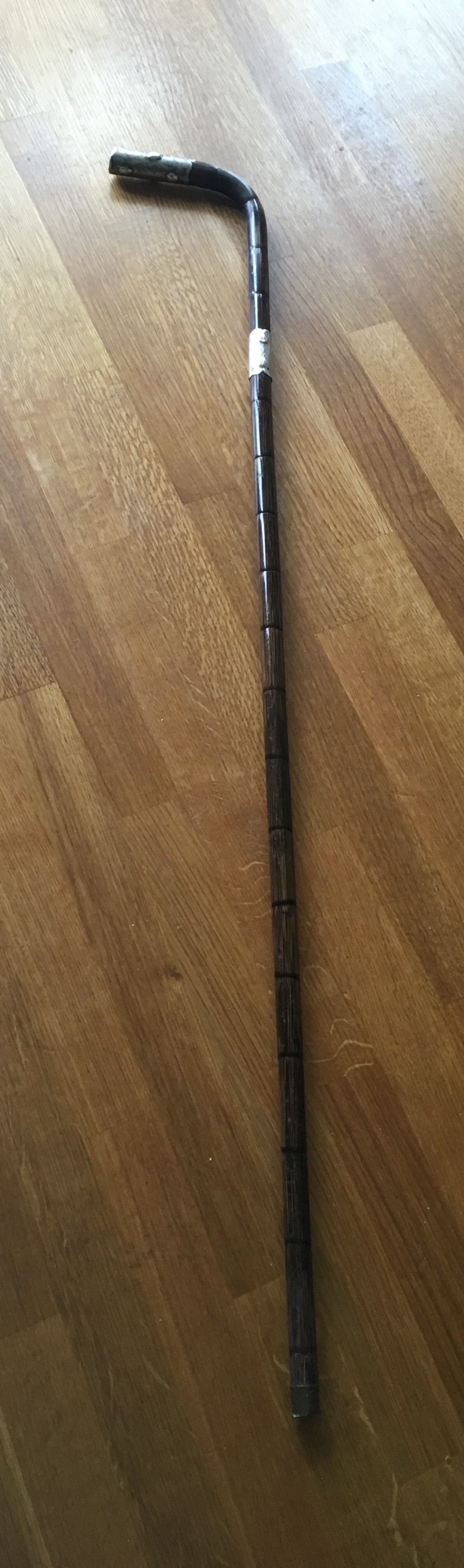 A palmwood cane with applied silver collar and top, the cartouche inscribed with the initials RHC I think