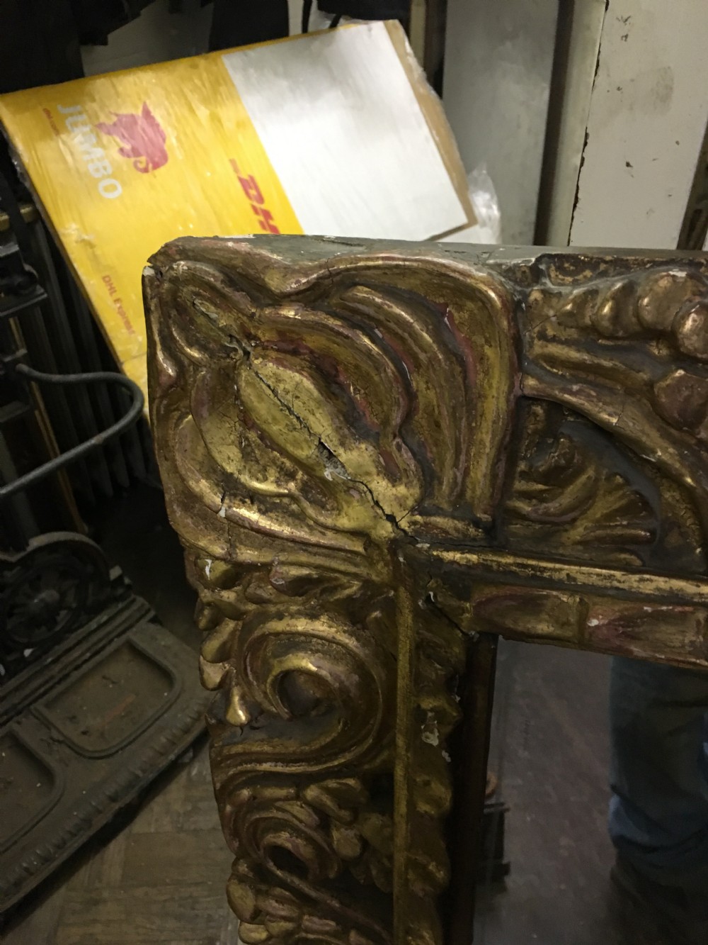 A good carved and water gilded frame, european in origin as its carved in walnut, this type of frame is usually italian or possibly spanish, probably C18th century, there is a small part of one corner carving missing, and a small piece off one corner on the inner carved slip.