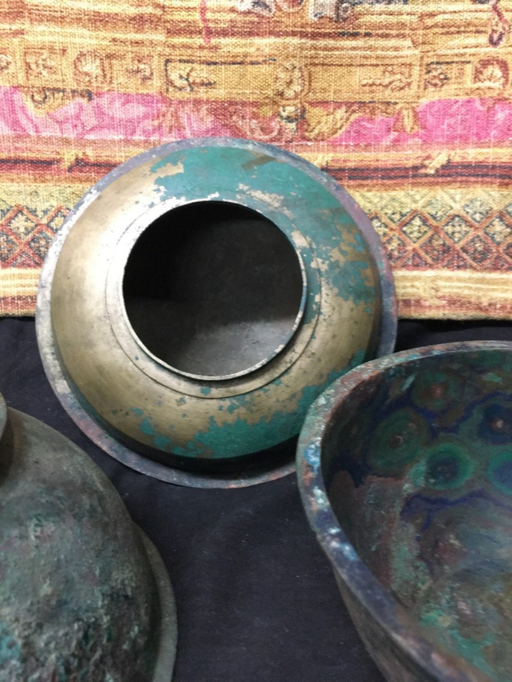 Wonderful bronze three piece stemer, incorporating the steamer base then a bowl with cut outs to the base to allow the steam to pass through and the lid, all three pieces then fit neatly inside each other and makes forma very good display, all of the pieces show wonderful patina.