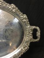 Large oval silver plated tray, the edges decorated with foliage and leafs, the tray also etched with scrolls and acanthus,decoration.