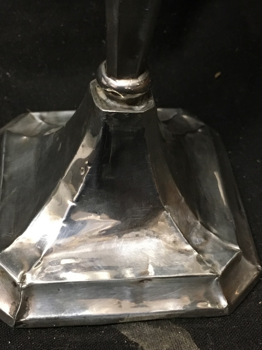 pair of tall English hallmarked solid silver candlesticks, one with Chester hallmarks the other Birmingham, with tapered octagonal shape .These beautifully crafted candlesticks have Had a lot of use but are still in good condition with some bumps, because of these slight blemishes it makes the price extremely good value for such sizeable solid silver candlesticks.