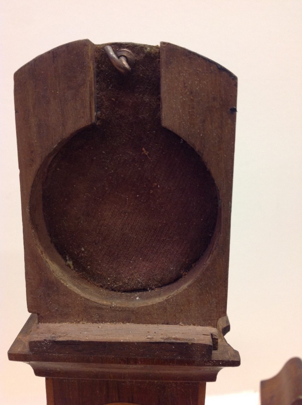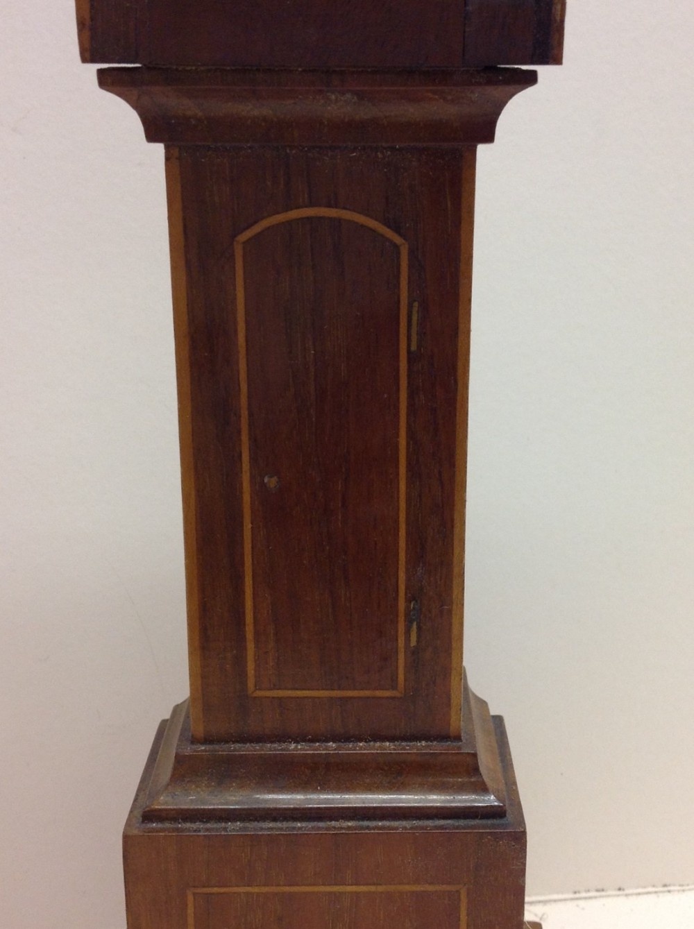 A good C19th watch stand shaped as a long case clock, line inlaid and constructed from mahogany, the top lifting off to reveal a hook to house an standard size long case clock. The pocket watch is for show and not included in the sale.