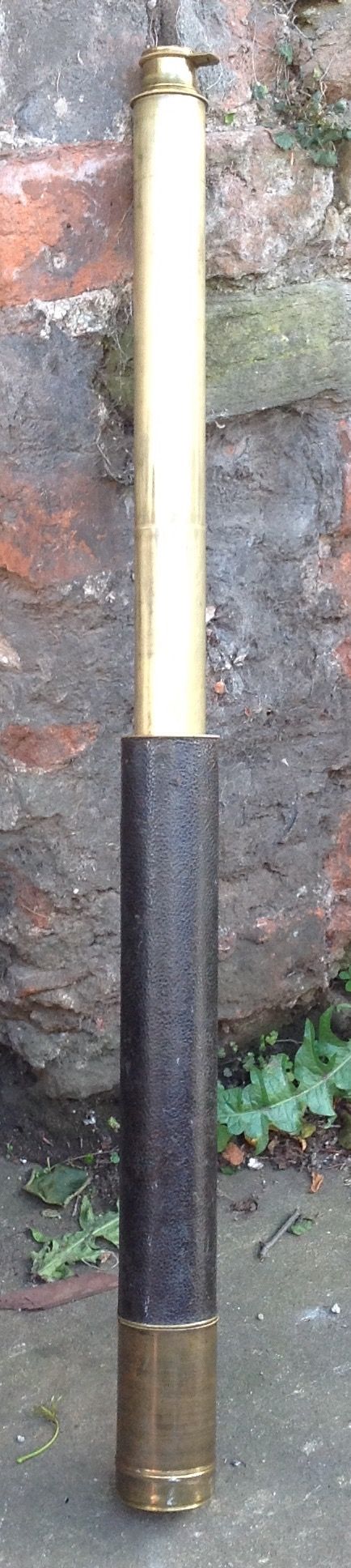 C19th officer of the watch draw telescope, the outside with leather sleeve, the brass scope has a protective cover, and sliding Windows, the inner drawer is marked A J & E Jacobs, mons Newport