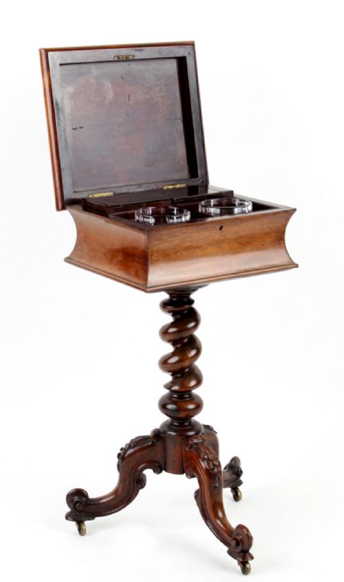 A Fine 19th century Victorian rosewood barleytwist teapoy by Druce & Co London. The splayed leg base with rococo carvings rising through to a thick barley twist column with sarcophagus shaped teapoy having an appointed interior within the hinged top. Druce & Co label to the underside.