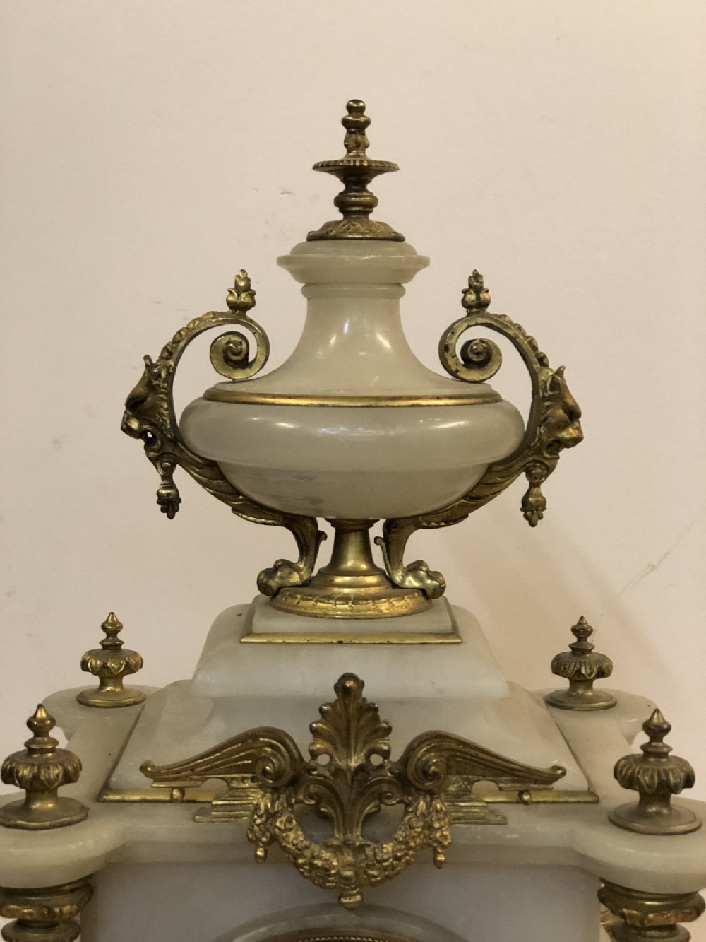 A top quality alabaster and ormolu mantle clock, the top surmounted by an urn with four turned column and mounted on four ormolu feet, with further mounts and embellishments all over, of good size.