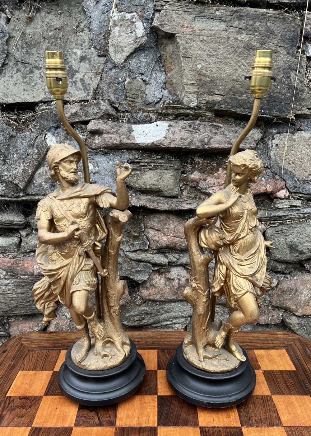 Pair of spelter table lamps modelled as a classical man and woman him in armour and her in robes measuring overall