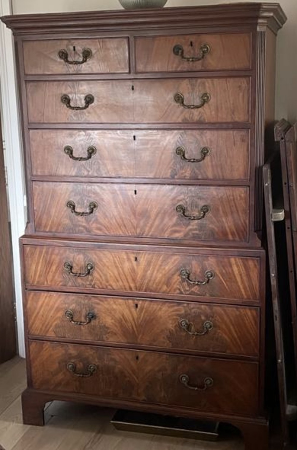 A completely original Georgian tallboy C1770 with canted corners, flame mahogany veneers and oak lined drawers and original brass handles, a joy of a piece of furniture Measuring Height 181cms Width 109cms Depth 56 cms Delivery can easily be arranged for this item smaller items are generally sent free of charge to the uk, larger items can be sent via a courier, I keep this service as cheap as possible, the larger items are picked up and delivered to you within 7-10 days should you require a quicker delivery expect to pay at least double the normal cost. If you are unhappy with any item I offer a full money back guarantee once the item is safely back in my possession and undamaged as a result of misuse. Please feel free to ring me with any queries you may have, I'm always happy to discuss anything to do with antiques !! Opening hours Thursday to Saturday 10am - 6pm. Or by appointment.
