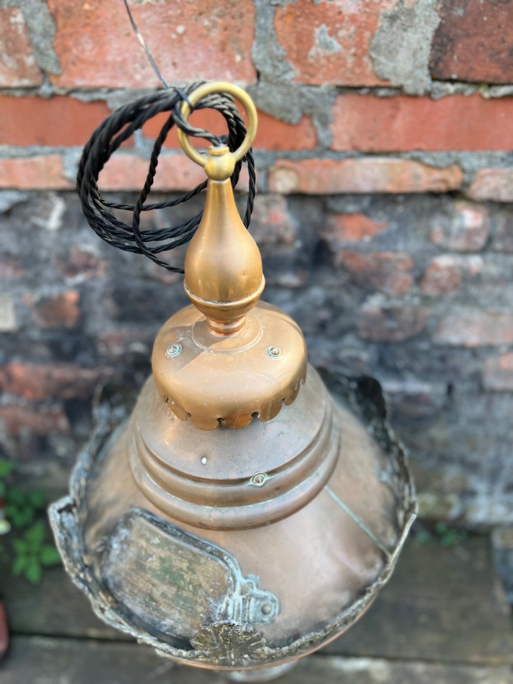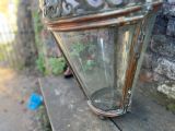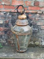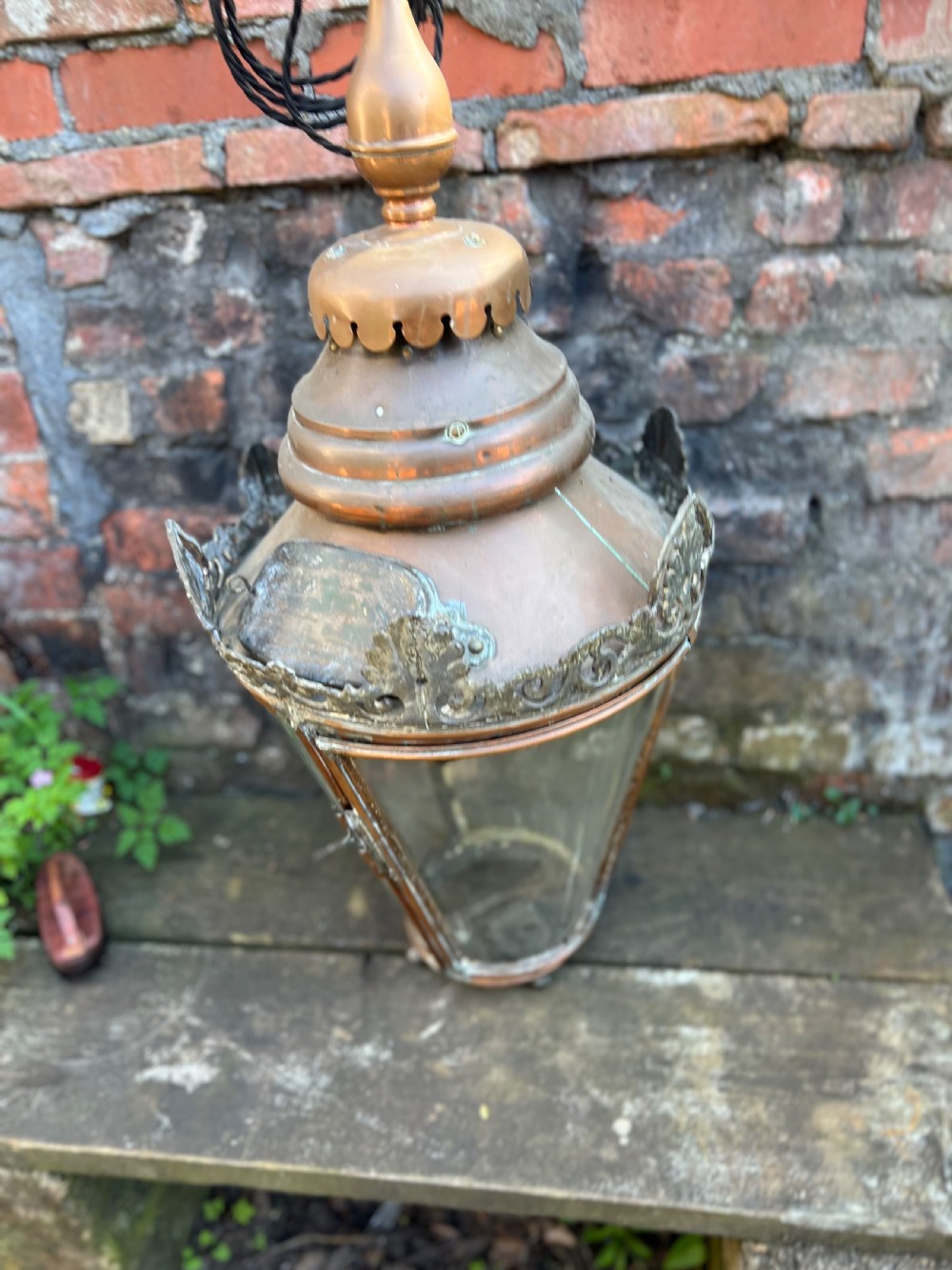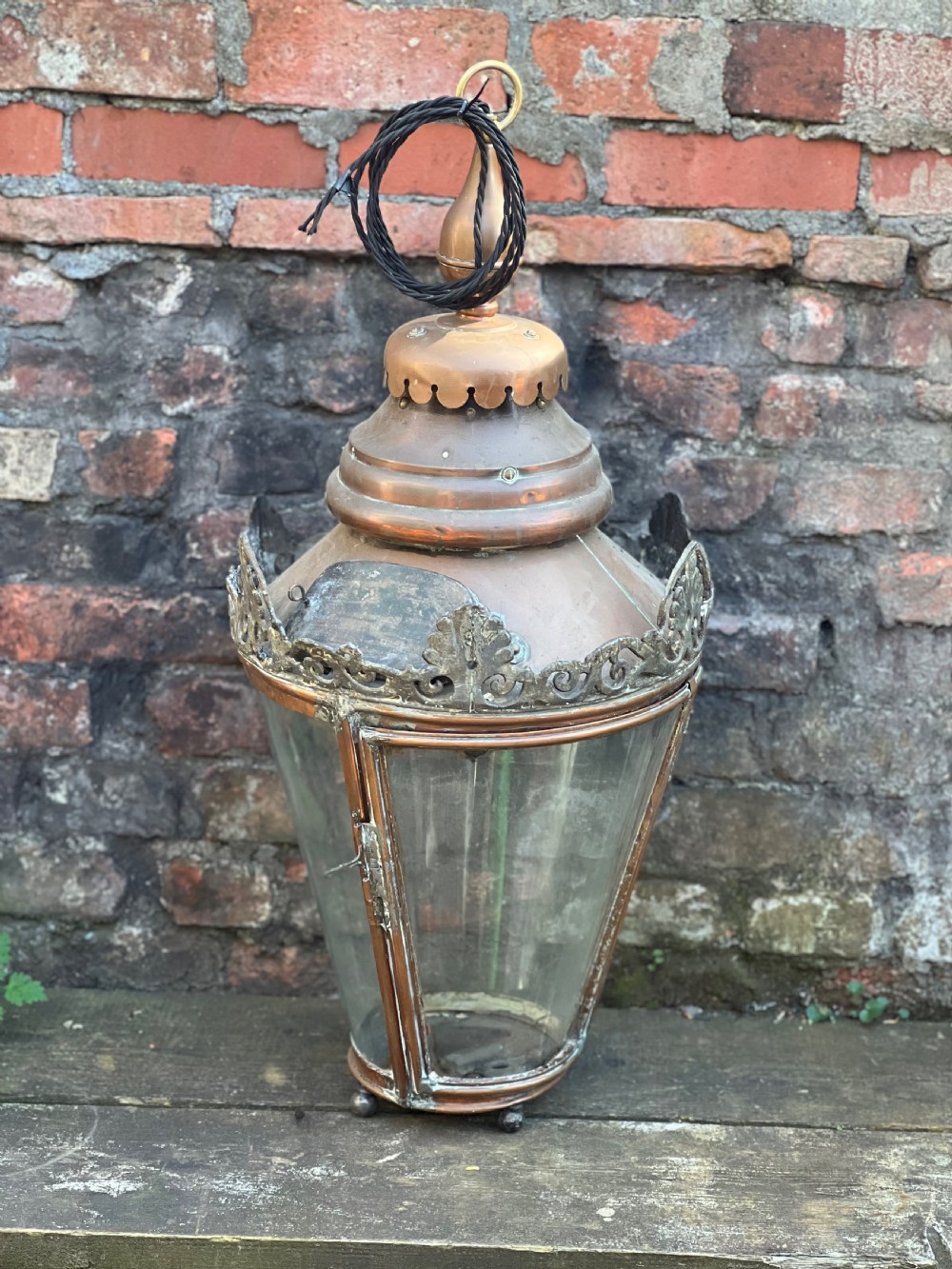 Copper circular lantern with original curved glass and working door, the top with a decorative lead border, the top with a circular loop for hanging and a set of for feet in case the lantern needs to sit on something Measuring Height 90 cms Width 50cms Depth 50 cms Condition Good, rewired and fully pat tested Delivery can easily be arranged for this item smaller items are generally sent free of charge to the uk, larger items can be sent via a courier, I keep this service as cheap as possible, the larger items are picked up and delivered to you within 7-10 days should you require a quicker delivery expect to pay at least double the normal cost. If you are unhappy with any item I offer a full money back guarantee once the item is safely back in my possession and undamaged as a result of misuse. Please feel free to ring me with any queries you may have, I'm always happy to discuss anything to do with antiques !! Opening hours Thursday to Saturday 10am - 6pm. Or by appointment.