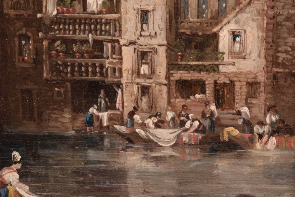 C19th small oil painting in gilt frame showing washing in the Seine